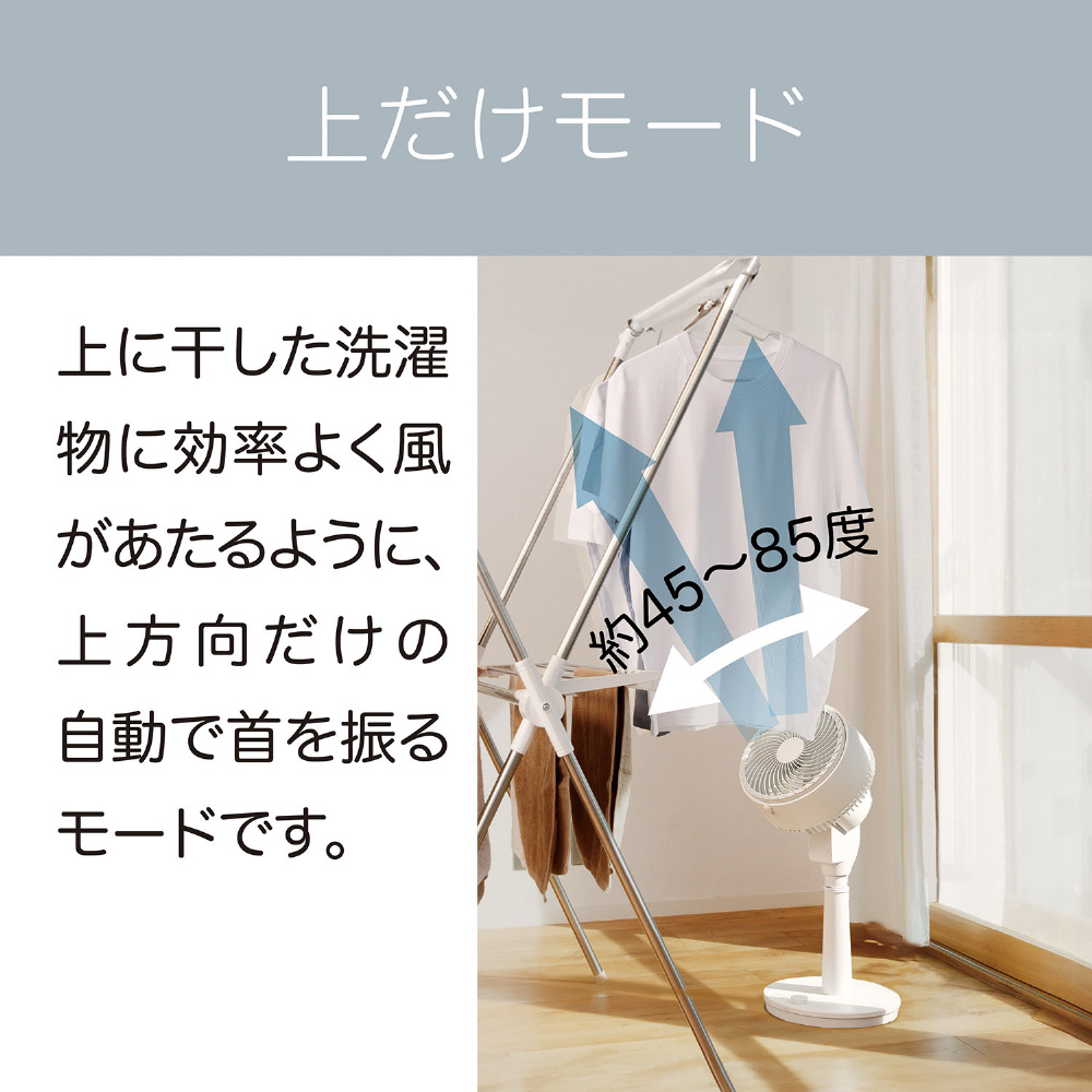 45度〜上方向だけの首振り「上だけモード」搭載で、部屋干しや暖かい空気の循環に最適