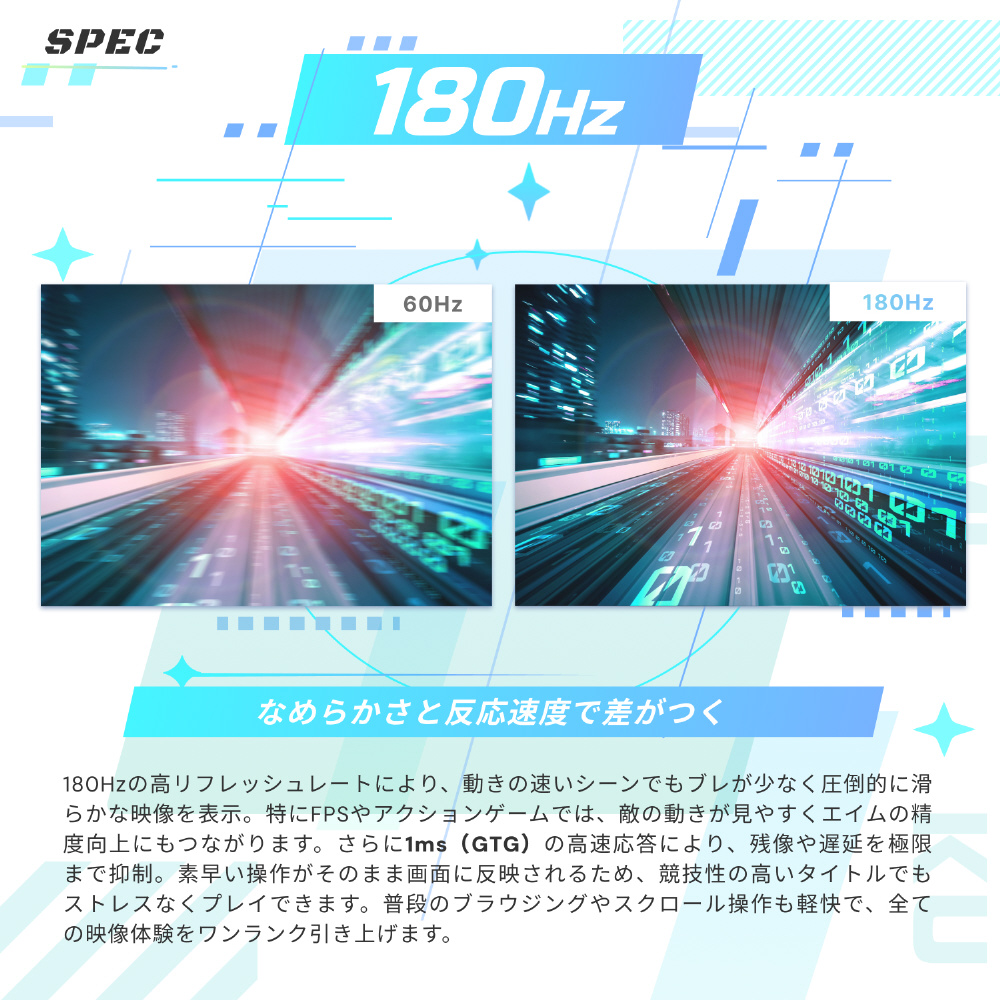 1秒間に最大180フレームを描写することで、一般的な60Hzのモニターと比べると映像がなめらかで視認性が良く、映像のブレが抑制されます。