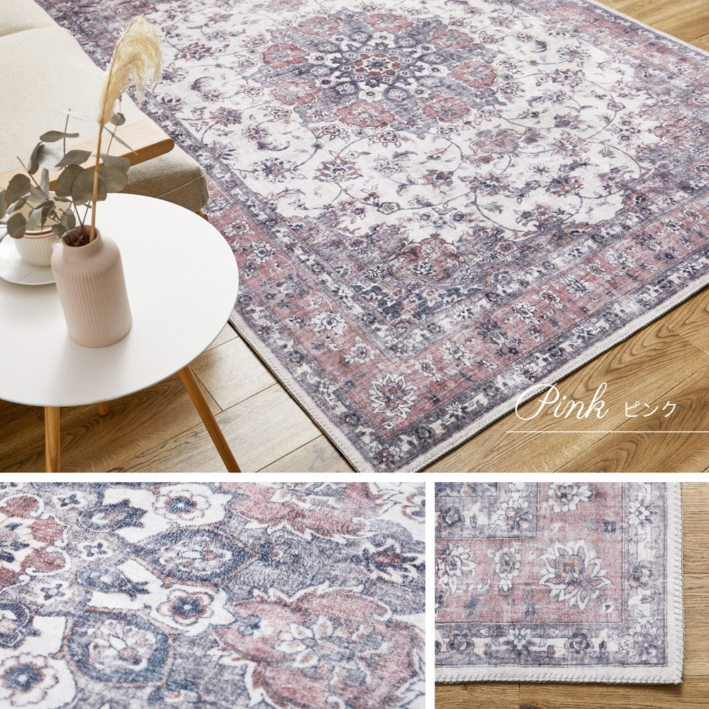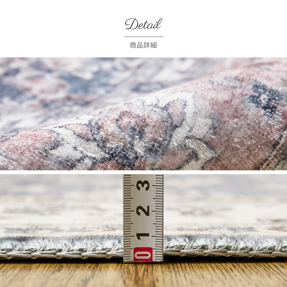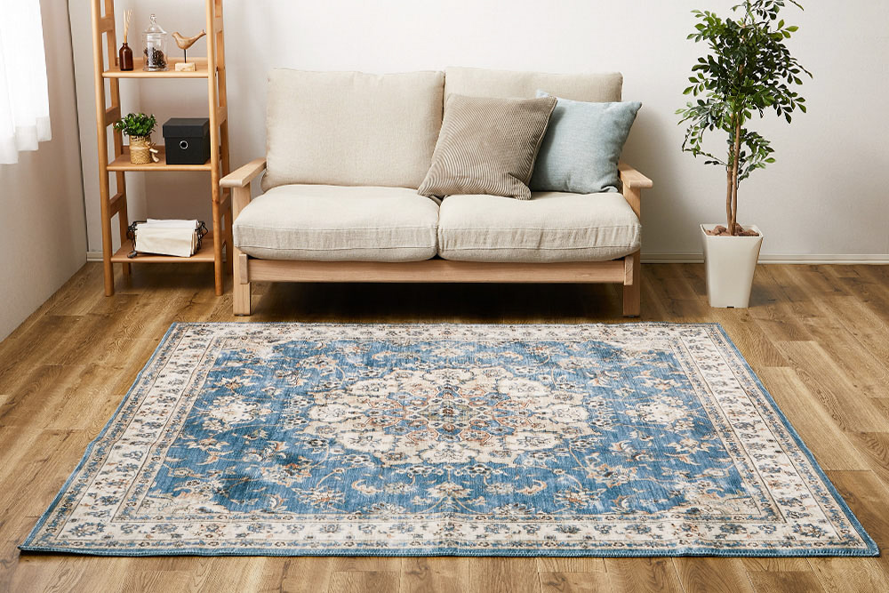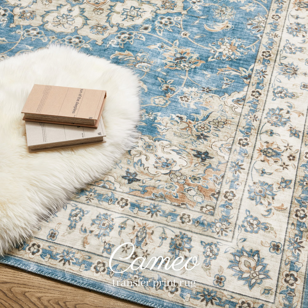 小さな模様や、ヴィンテージのようなかすれ感を細部までプリントで表現した、まるで高級ラグのような一枚。