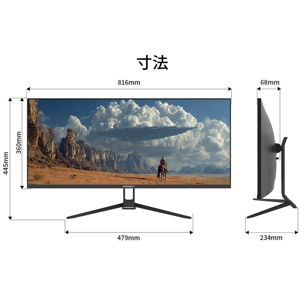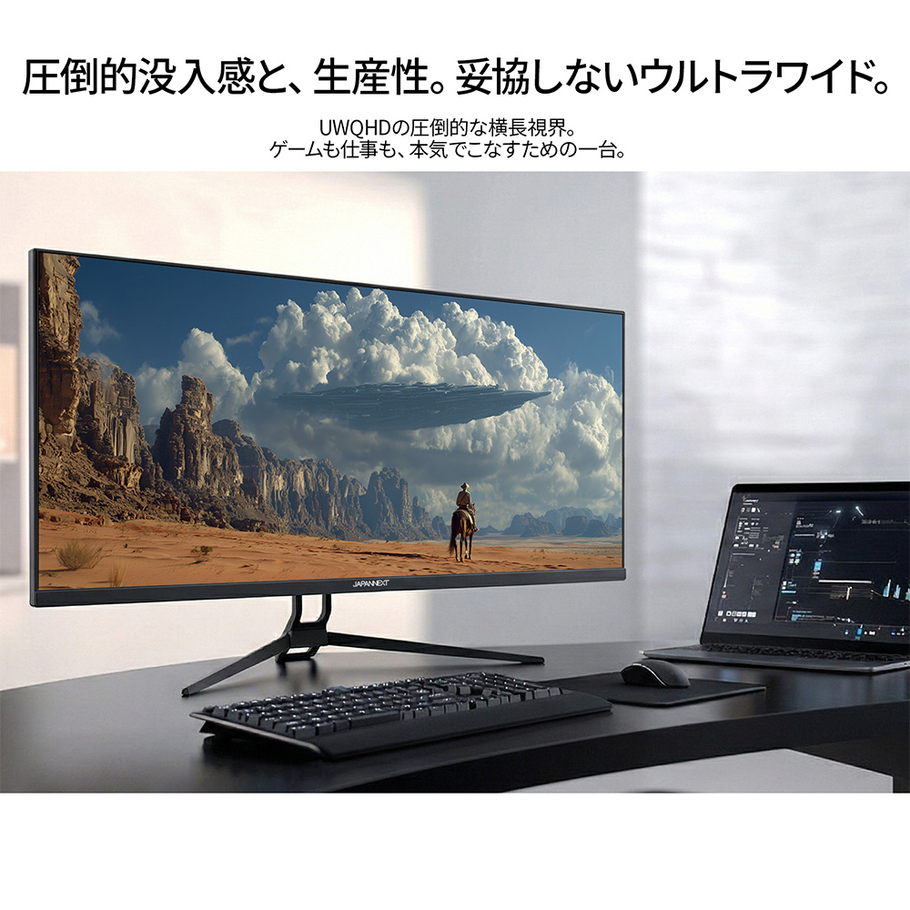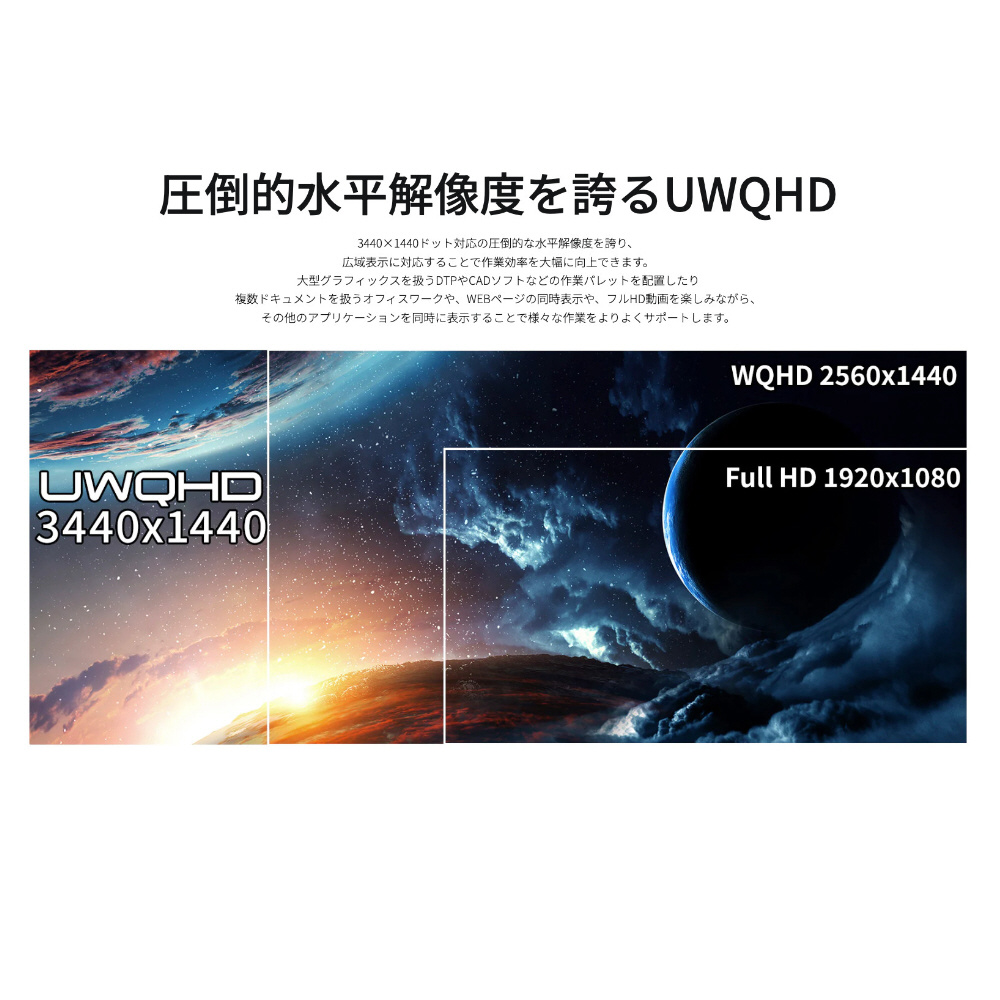 34インチのIPSパネルを搭載した、UWQHD(3440×1440)解像度のゲーミングモニターです。UWQHD(3440×1440)解像度はフルHDの約2.4倍の高解像度を実現、水平解像度はフルHDより80%広く、ゲームプレイ時だけでなく、デスクワークに使用時にも高い生産性を実現できます。