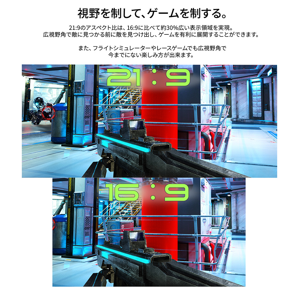 ■34インチの上下左右178度の視野角に対応した高画質IPSパネルは、画面の端まで均一に見やすく、色鮮やかな映像を再現し、どの角度からでも美しい画質で臨場感あふれるゲーム体験を提供します。21:9のアスペクト比により、広い表示領域を活用でき、FPSや情報量が重要なMMOなどのゲームプレイに最適です。