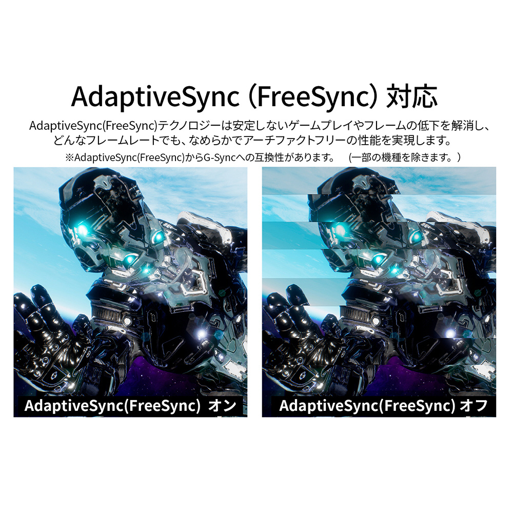 ■AdaptiveSync(FreeSync)に対応。画面のリフレッシュレートとコンテンツのフレームレートのズレから生じるティアリングを防ぎ、滑らかで美しい映像を実現します。また、長時間使用時に眼に優しいフリッカーフリー(ちらつき軽減)、ブルーライト軽減モードを搭載します。