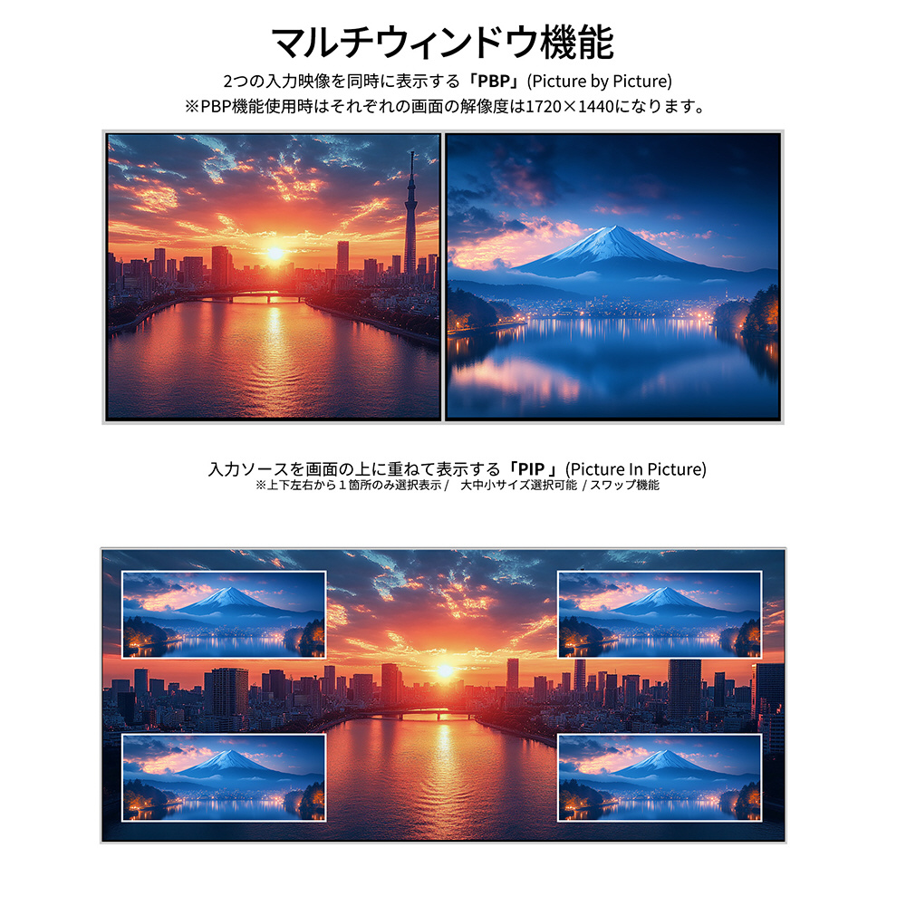 ■複数の入力を同時に表示する「PBP(Picture by Picture)」に対応、PBPモードでは、最大2つの入力映像を左右同時に表示可能。入力の一つを子画面にて表示する「PIP(Picture in Picture)」も可能です。