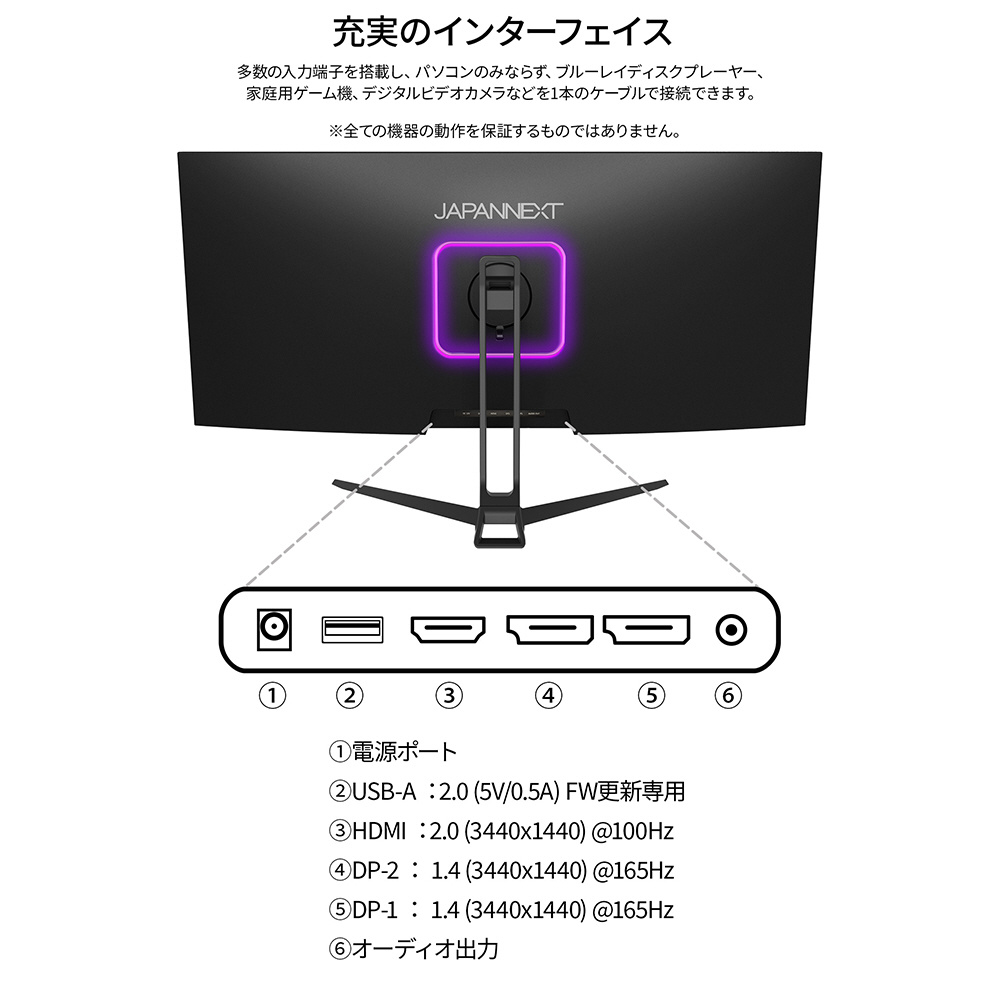 ■入力端子は、HDMI 2.0×1 (UWQHD:100Hz/WQHD:120Hz)とDisplayPort 1.4×2 (165Hz)を装備し、様々な機器との接続が可能です。