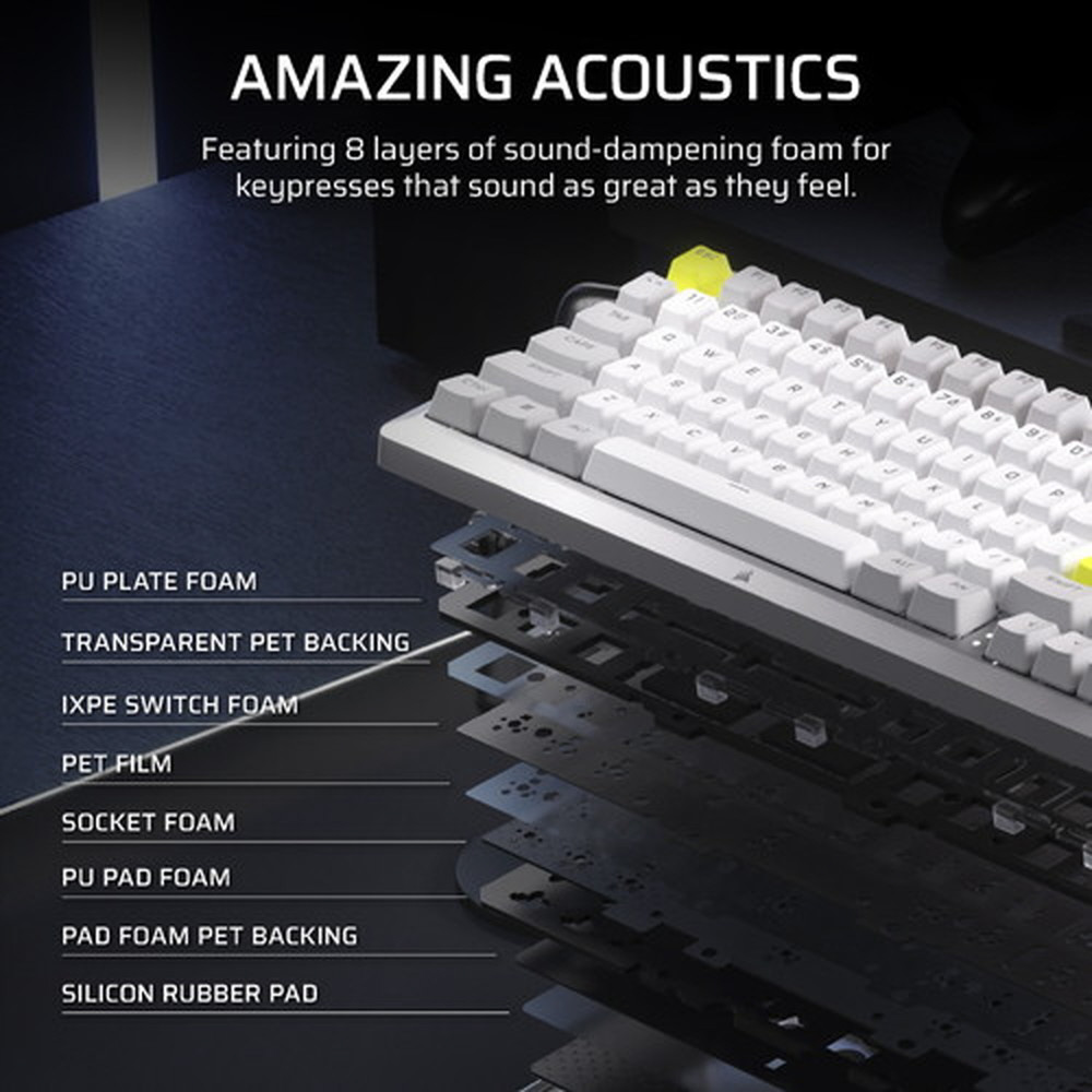 MAKR 75 は、長年にわたるキーボードの研究、設計、テストの成果です。よりソフトなタイピング感を実現するガスケットマウントを採用し、5 ピンスイッチやねじ込み式スタビライザーにも対応して満足のいくキープレスになっています。8 層の消音材により、キーストロークも素晴らしいサウンドです。