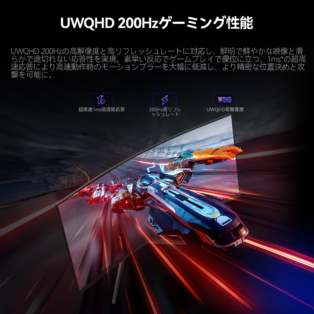 UWQHD のクリアな表示、200Hz の滑らかさ、VAパネルならではの 3500:1 コントラスト。