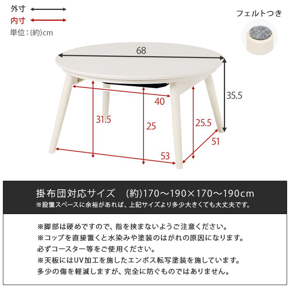 まるくてかわいいフォルムが特徴の丸型こたつ。脚を折りたたむとオフシーズンはコンパクトに収納可能。