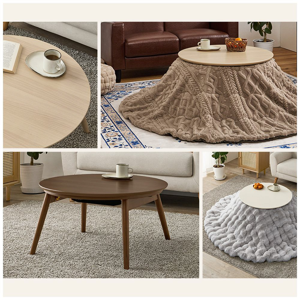 まるくてかわいいフォルムが特徴の丸型こたつ。脚を折りたたむとオフシーズンはコンパクトに収納可能。