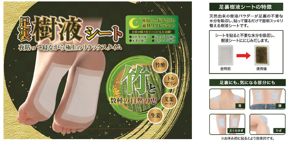 天然由来の樹液パウダーが足裏の不要な水分を吸収し、貼って寝るだけで翌朝スッキリ整える樹液シートです。