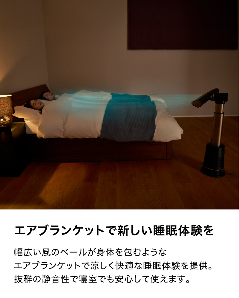 ■ベッドに向けて横向きに設置すれば、幅広い風のベールが身体をふわりと包むようなエアブランケットで、身体の上を風が通り抜ける涼しく快適な睡眠体験を提供します。