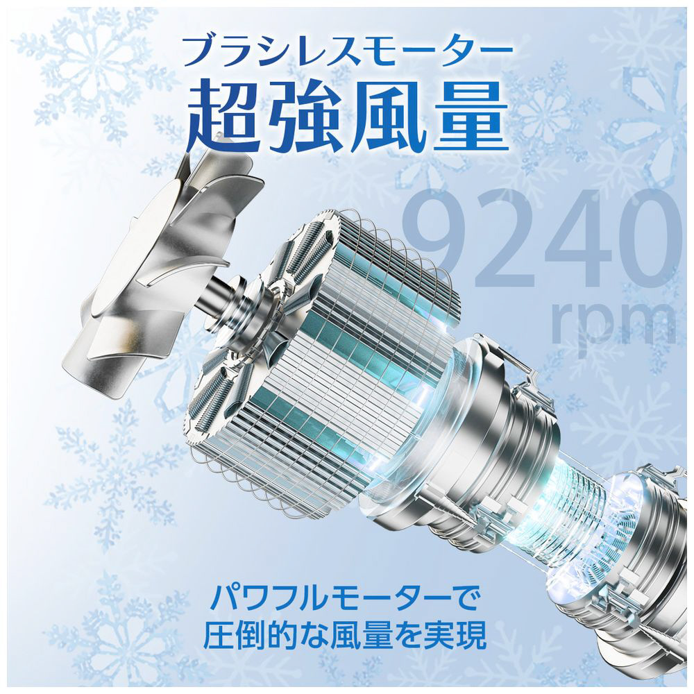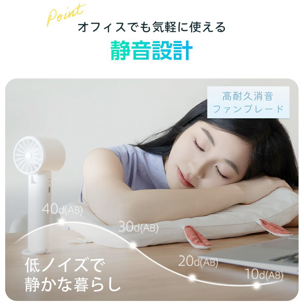 風量と残量が一目でわかるLED表示、最長21時間使える大容量バッテリー、わずか185gの軽量設計で持ち運びもラクラク!