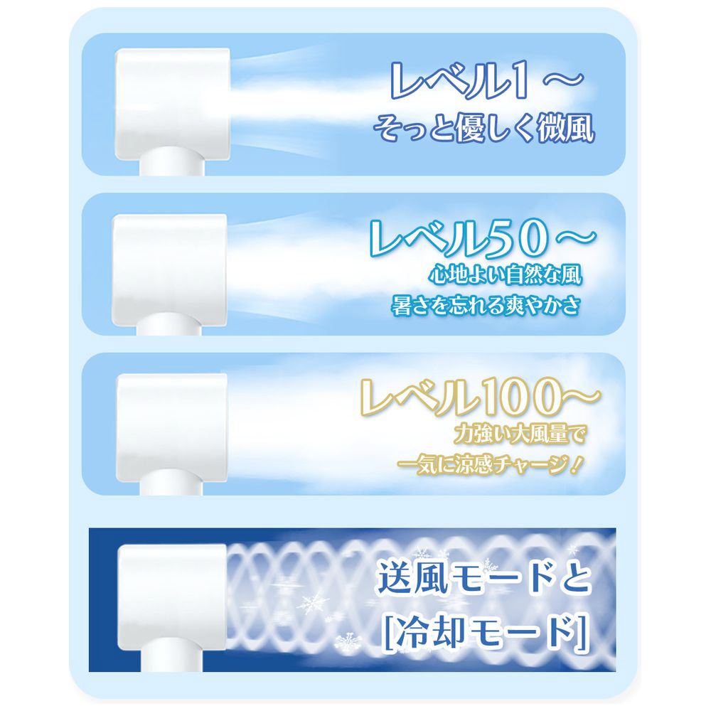 短押しで1・25・50・75・100%の5段階切替、長押しで1〜100段階の細かな風量調整が可能。シーンに応じた最適な風をお楽しみいただけます。