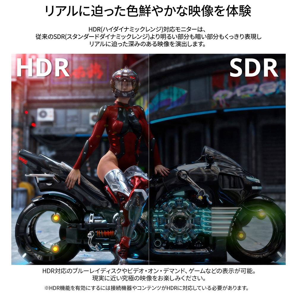 ■HDR(ハイダイナミックレンジ)は、明るい部分も暗い部分もくっきり表現し、リアルに迫った深みのある映像を演出します。HDR対応のブルーレイディスクやビデオ・オン・デマンド、ゲームなどの表示が可能。現実に近い美しい映像をお楽しみください。