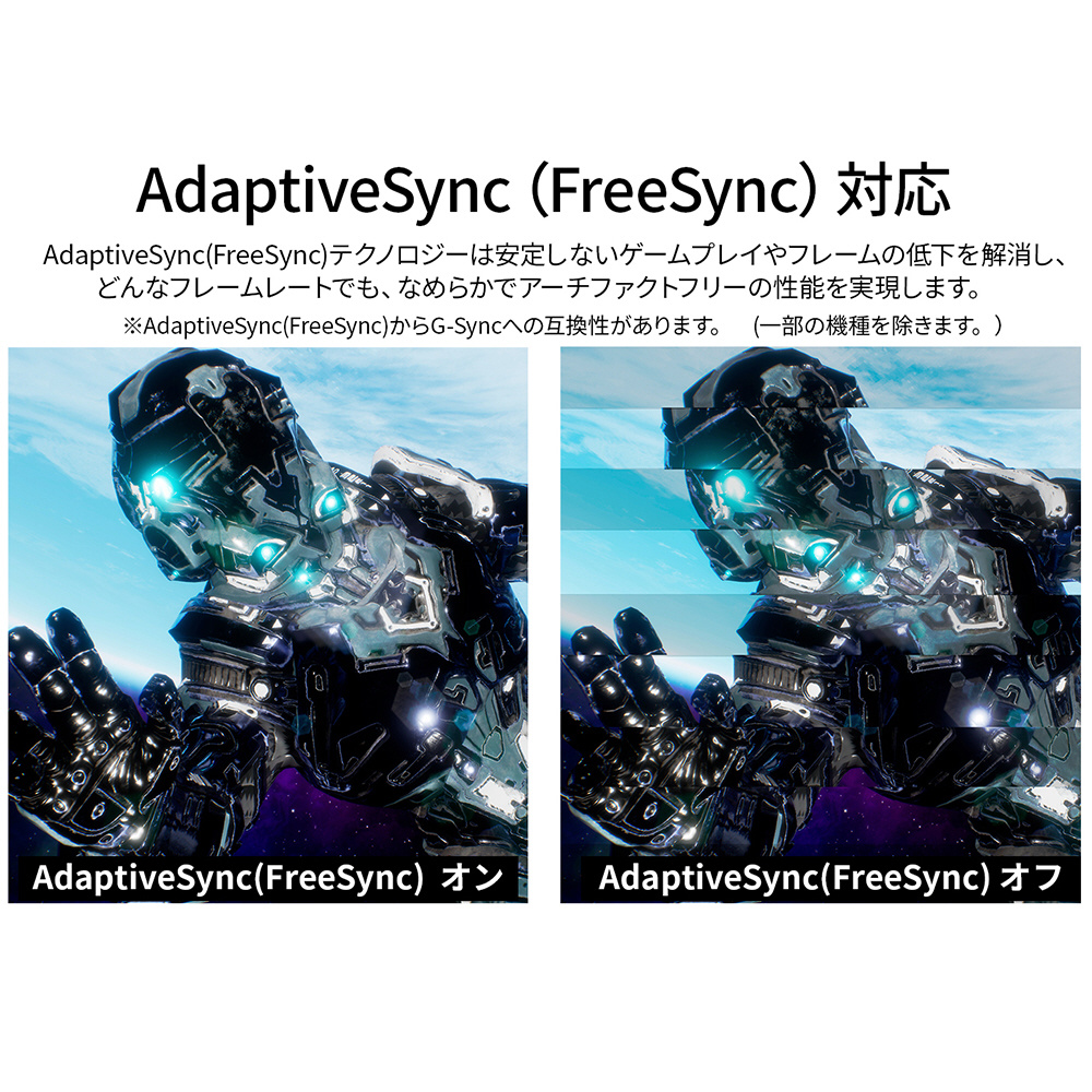 ■AdaptiveSync(FreeSync)に対応。画面のリフレッシュレートとコンテンツのフレームレートのズレから生じるティアリングを防ぎ、滑らかで美しい映像を実現します。また、長時間使用時に眼に優しいフリッカーフリー(ちらつき軽減)、ブルーライト軽減モードを搭載します。