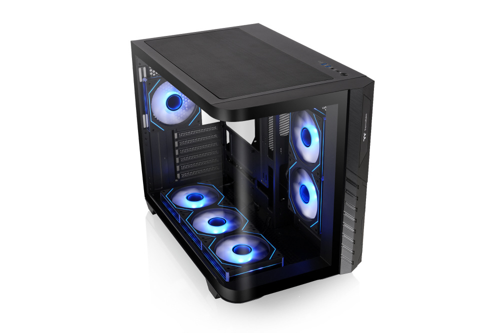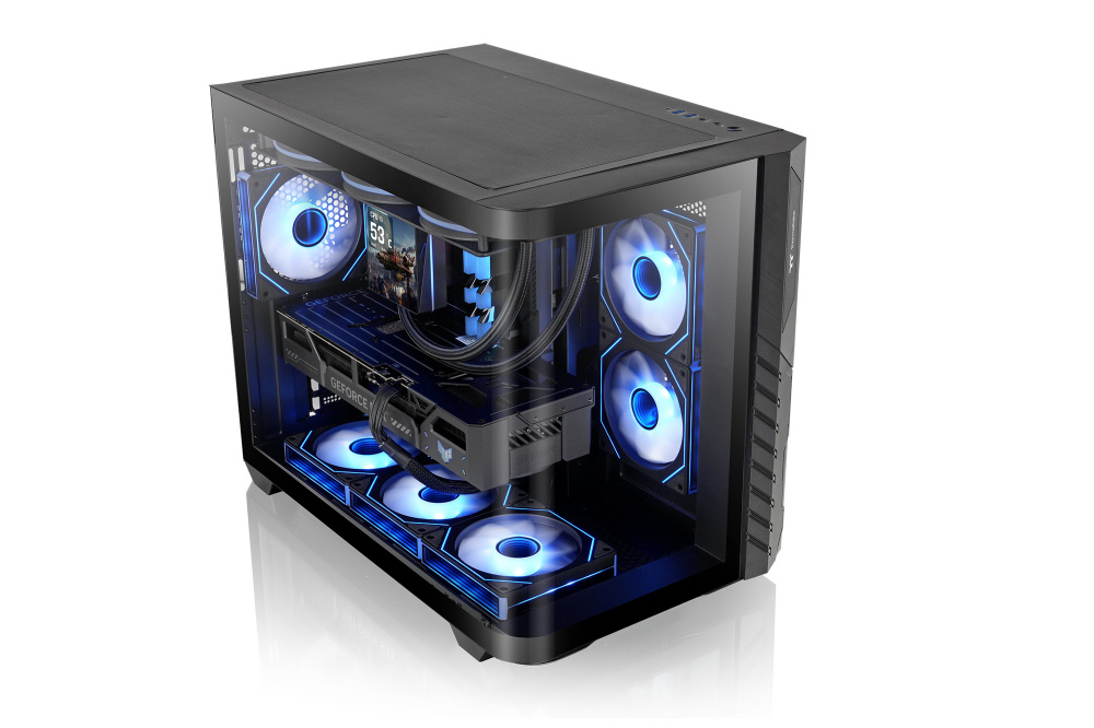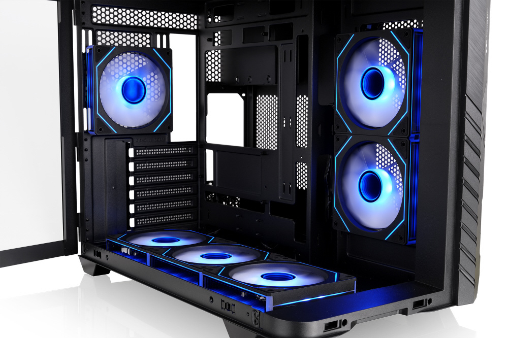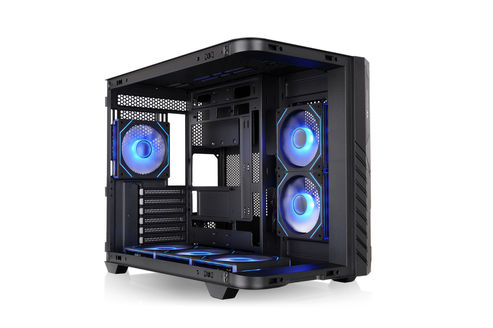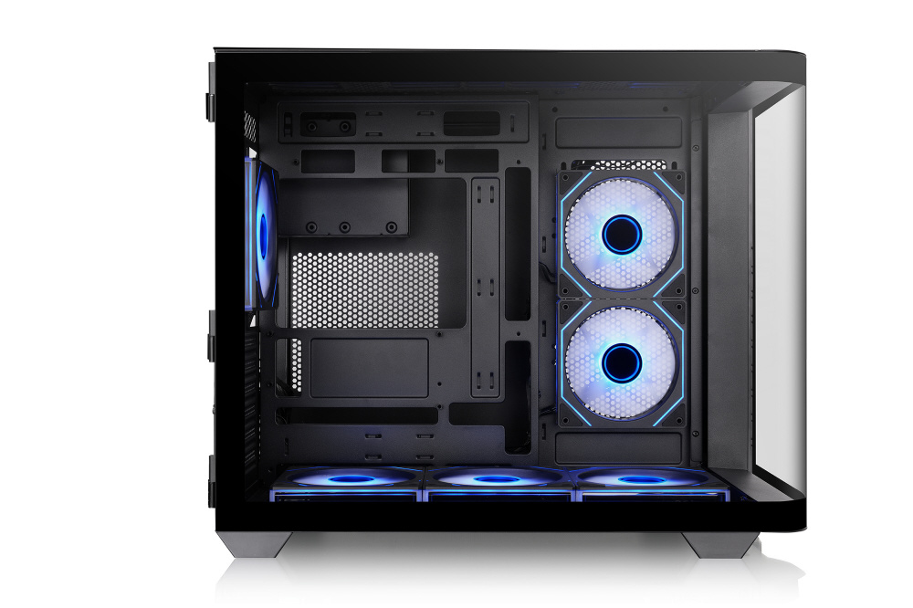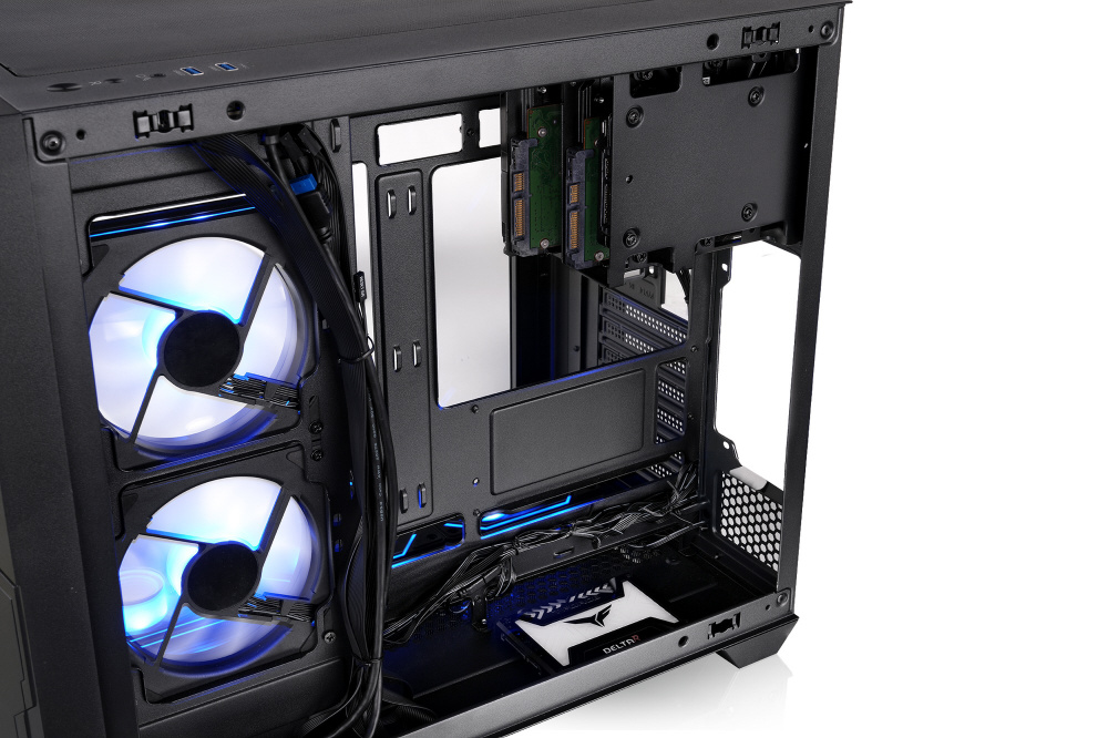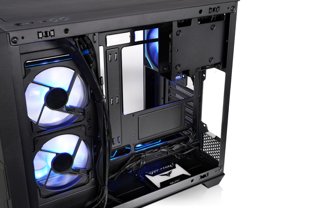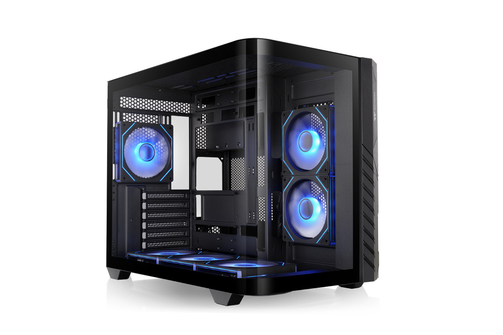 曲面強化ガラスパネルを採用したピラーレスデザイン。ARGBファンを6基備え背面コネクタ設計のマザーボードに対応したミドルタワー型PCケース