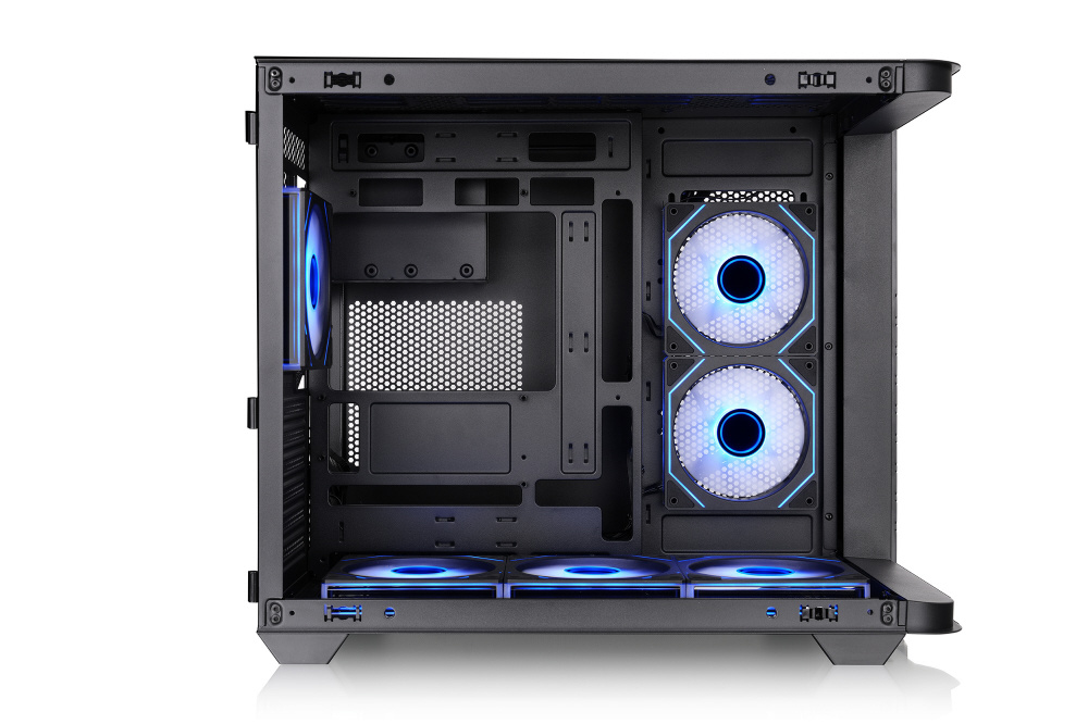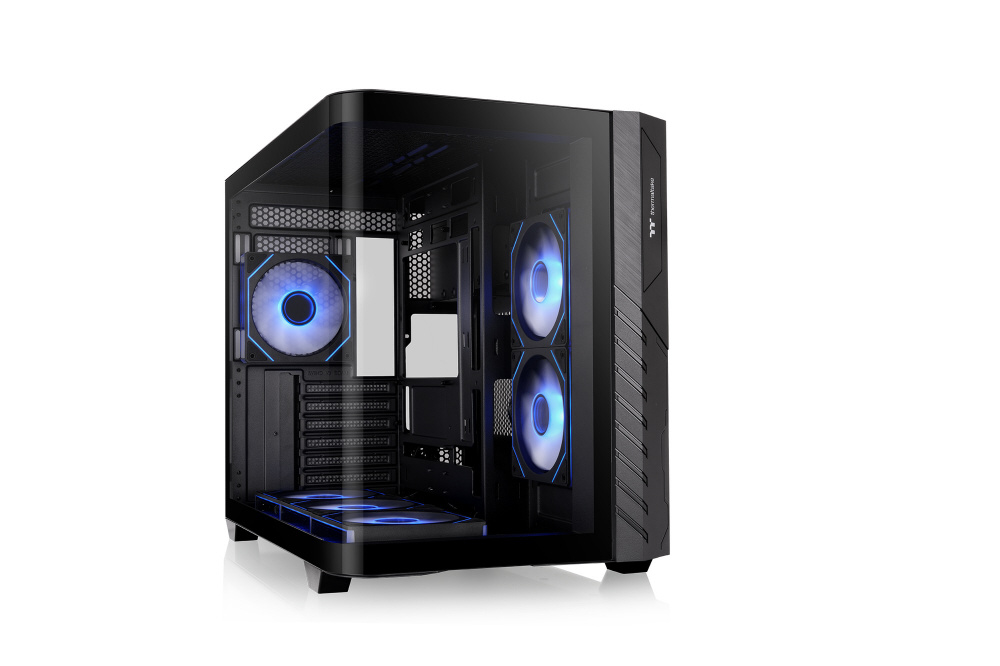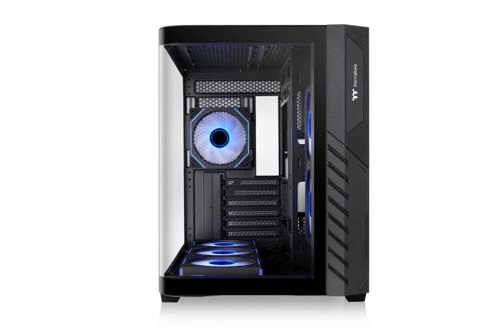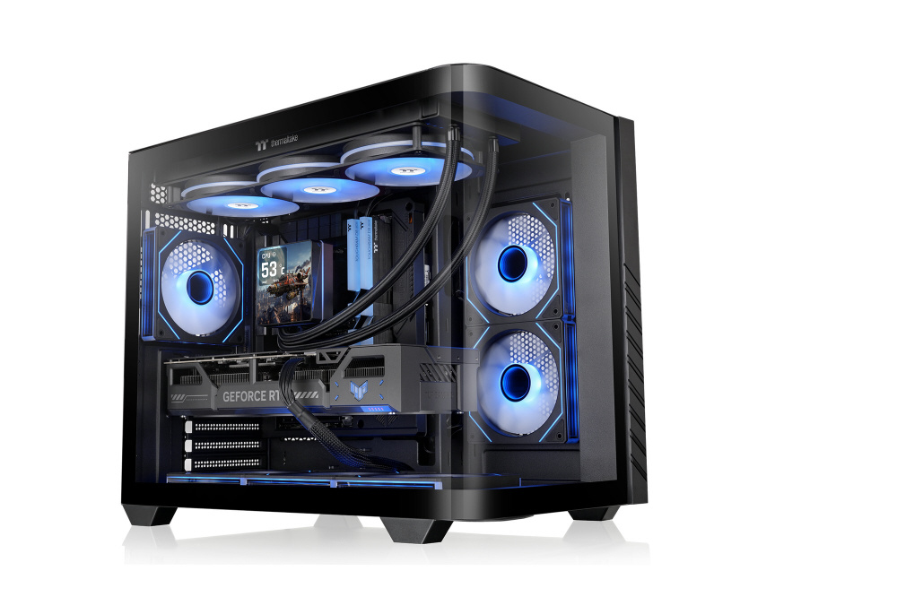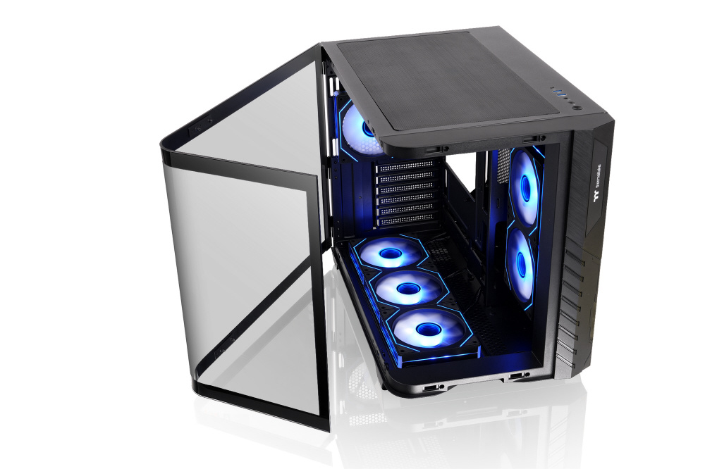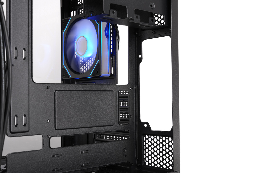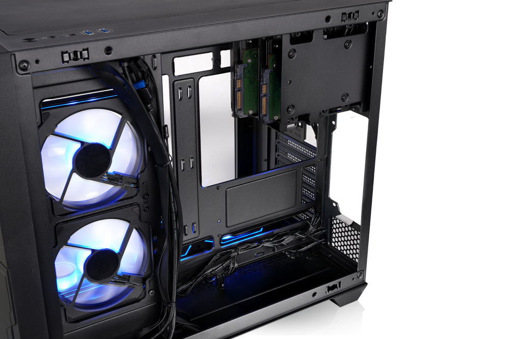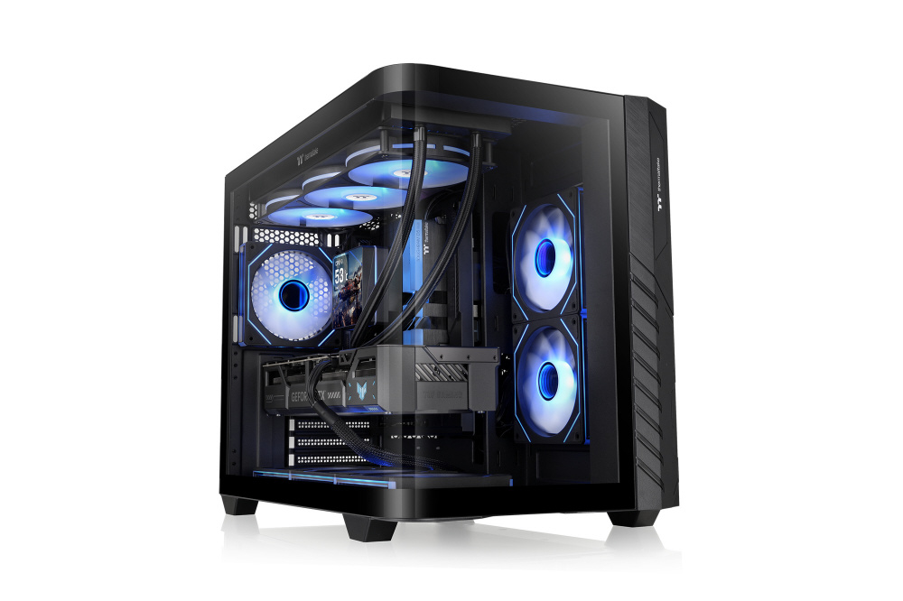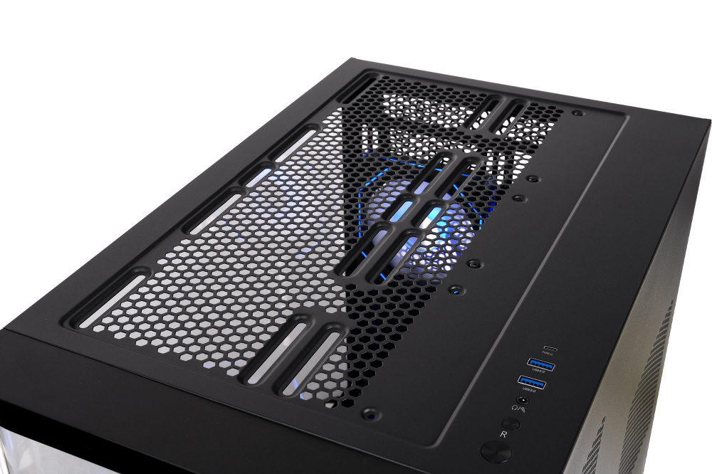 曲面強化ガラスパネルを採用したピラーレスデザイン。ARGBファンを6基備え背面コネクタ設計のマザーボードに対応したミドルタワー型PCケース