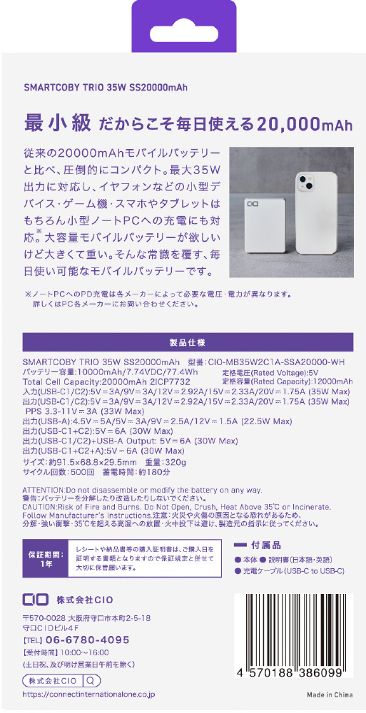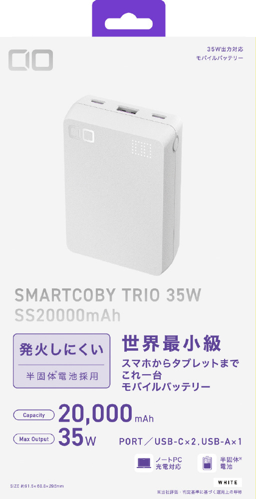 SMARTCOBY TRIO 35W SS20000mAh? ホワイト CIO-MB35W2C1A-SSA20000-WH [USB Power Delivery対応]