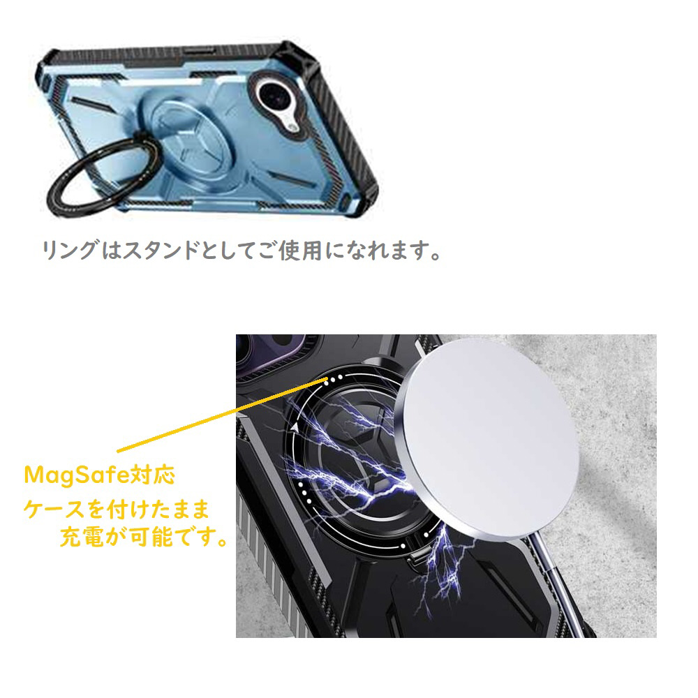 ●ケースにあるリング部分でマグセーフ充電も可能、ケースを付けたまま充電できます。