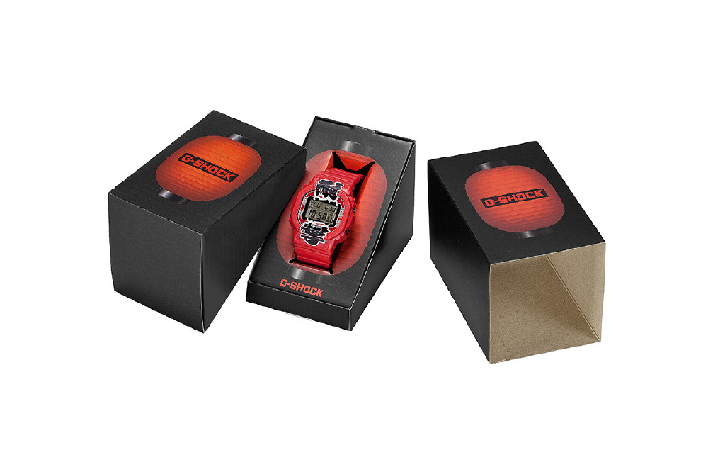 提灯の赤をベースカラーに、ベゼルからバンドに至るまで、G-SHOCKの最たる特徴である「耐衝撃」のプリントを特徴的なフォントで配したユニークなデザイン。バックライトや持ち手の色味にインスパイアされたボタンと遊環など、赤提灯の特徴をG-SHOCKに詰め込んだこだわりの仕様となっています。裏蓋にも提灯のモチーフを刻印しているほか、パッケージも暗闇に浮かび上がる赤提灯を大胆にあしらった特別仕様です。