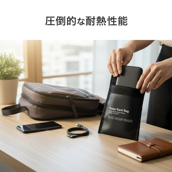 一般的なナイロンやPU素材では実現できない800℃耐熱性能を実現。モバイルバッテリーの発火リスクに対応した本格的な安全設計です。
