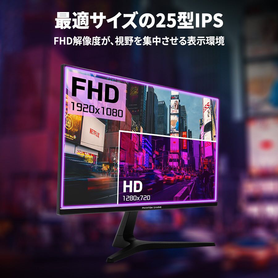 | 仕様1 | ●カラー:ブラック ●製品サイズ:W557×H432×D205mm(スタンド取付時) ●製品重量:2.97kg(スタンド取付時) ●搭載パネル:25型 IPSパネル アンチグレア(フラット) ●解像度:FHD(1920×1080) ●コントラスト比:1000:1 ●リフレッシュレート:180Hz(最大) ●視野角:178度(縦横) ●応答速度:1ms MPRT/ 1ms GTG ●色域:94% DCI-P3 / 126% sRGB ●輝度:300cd/m2(標準) |