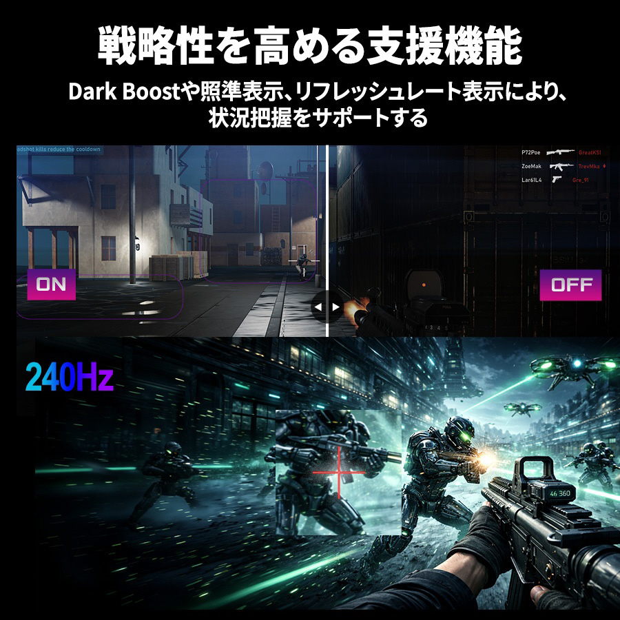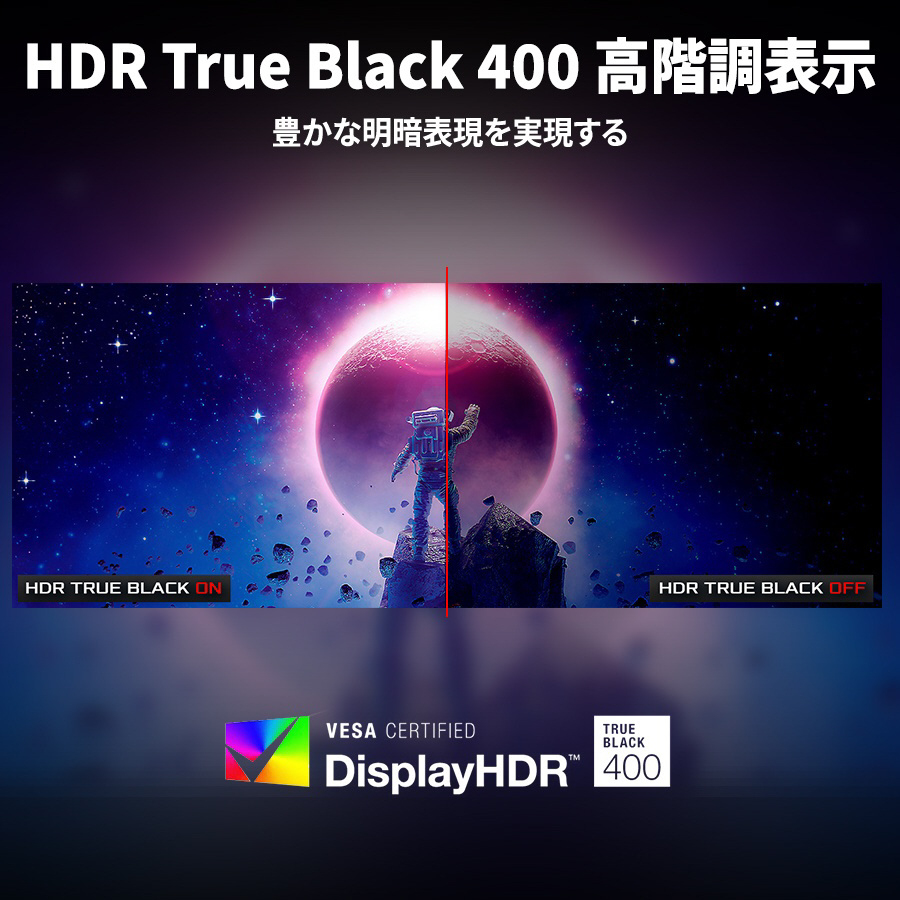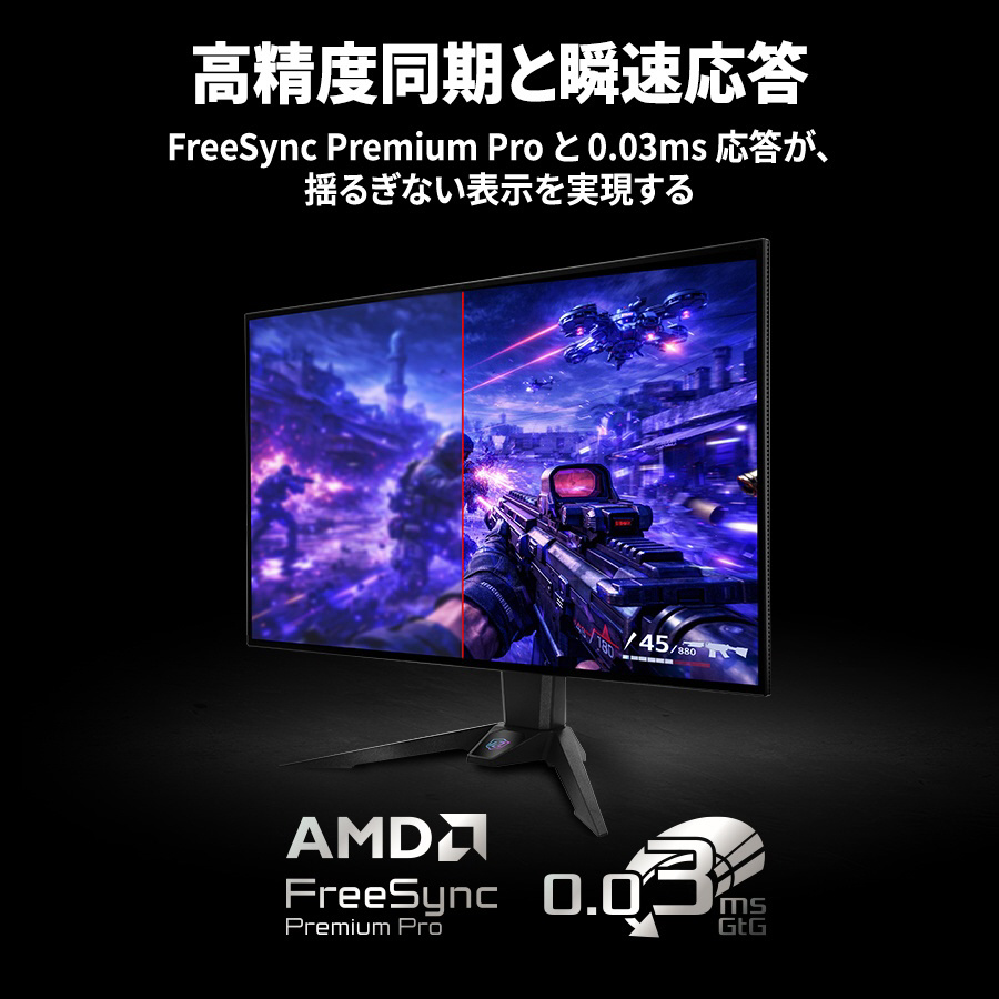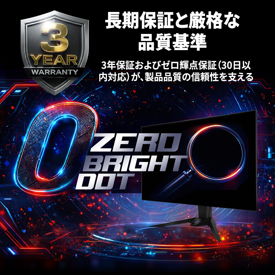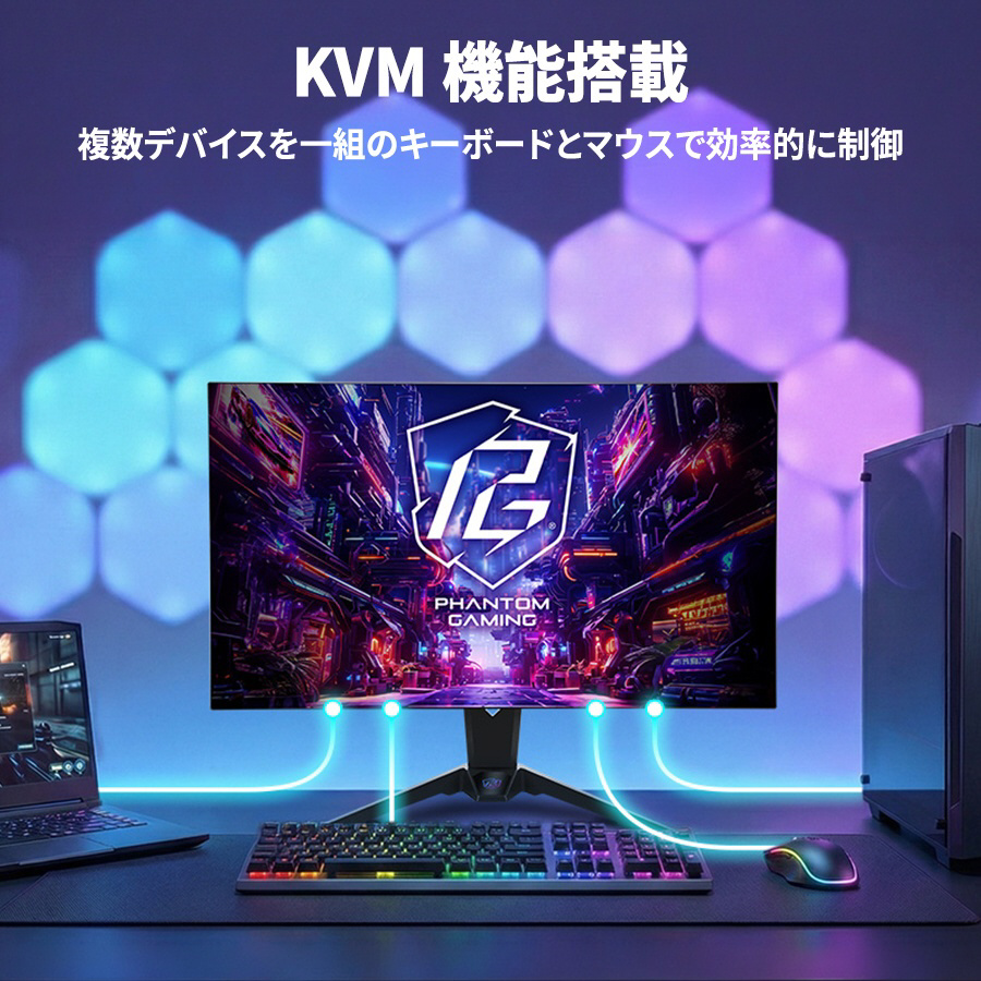 | 仕様3 | ●VESAマウント:100×100mm ●電源:AC 100~240V 50/60Hz(240Wアダプター) ●消費電力:0.3W(電源オフ) / 0.5W(待機時) / 最大235W ●付属品:HDMIケーブル、DisplayPortケーブル、USB Type-Cケーブル、USB Type-A to Bケーブル、電源アダプター、電源コード、クイックスタートガイド、Phantom Gamingケーブルスリーブ |
