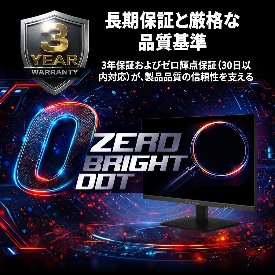 | 仕様3 | ●付属品:HDMIケーブル、DisplayPortケーブル、電源コード、クイックスタートガイド、Phantom Gamingケーブルスリーブ |