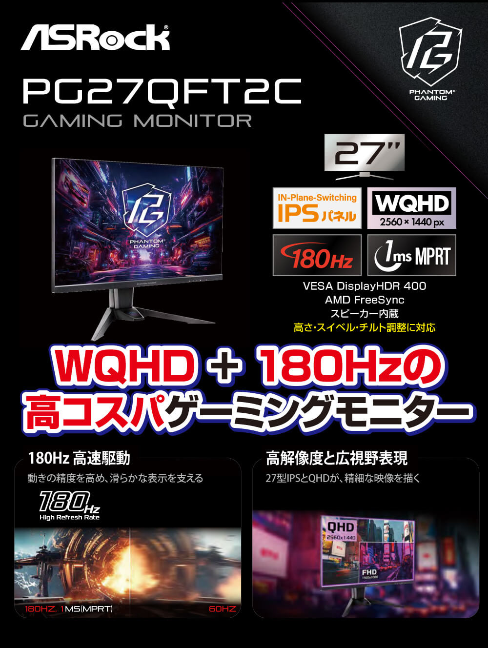 PG27QFT1B ASRock ゲーミングモニター [27型 /WQHD(2560×1440) /180Hz]