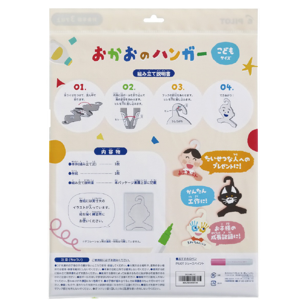段ボールでできた顔型のオリジナルハンガーです。自由に塗料やペンを利用して「おかお」を描くことができます。描き終えたらハンガーとして使ったり、飾ることができます。親子で似顔絵を描き合い、お互いにプレゼントしたり、母の日や父の日、敬老の日といったギフトシーン、夏休み・冬休みなどの工作、さらには大人の「推し活」や寄せ書きなど、幅広いシーンでお楽しみください。
