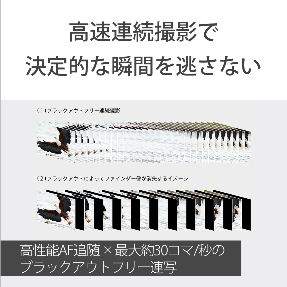 さらに、新開発の部分積層型CMOSイメージセンサーにより、AF/AE追随機能をフル活用した最大約30コマ/秒のブラックアウトフリー高速連続撮影が可能になりました。