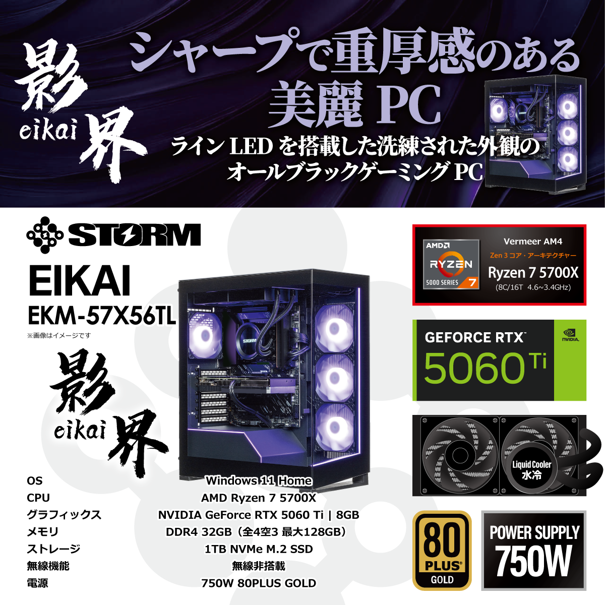 ゲーミングデスクトップパソコン EKM57X56TL [RTX5060Ti] 【影界シリーズ】