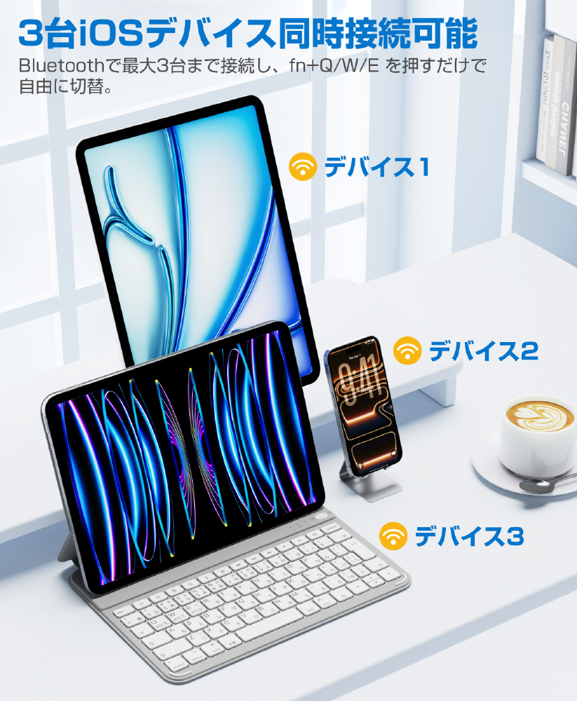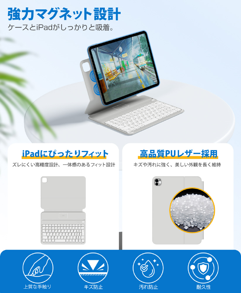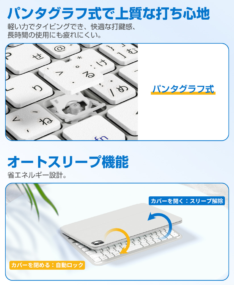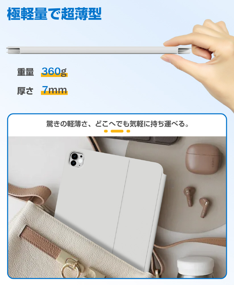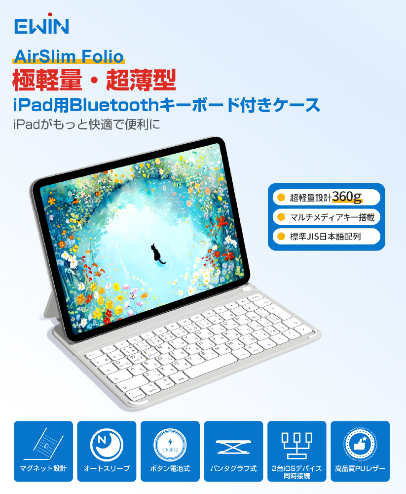 AirSlim Folioは、磁気吸着設計によりiPadへスマートに装着できるキーボード付きケース。薄さ約0.7cm・重さ約360gのスリム設計で携帯性を損なわず、iPadをノートPCのように活用可能。最大3台マルチ接続対応の実用性に優れたモデルです。