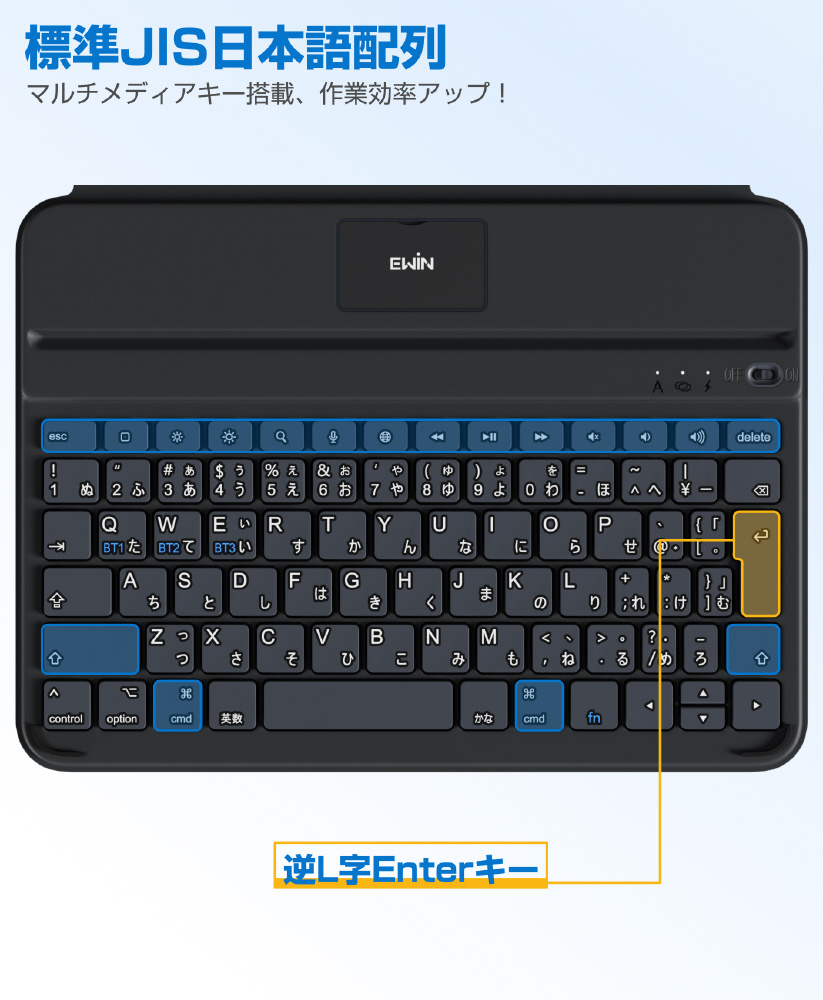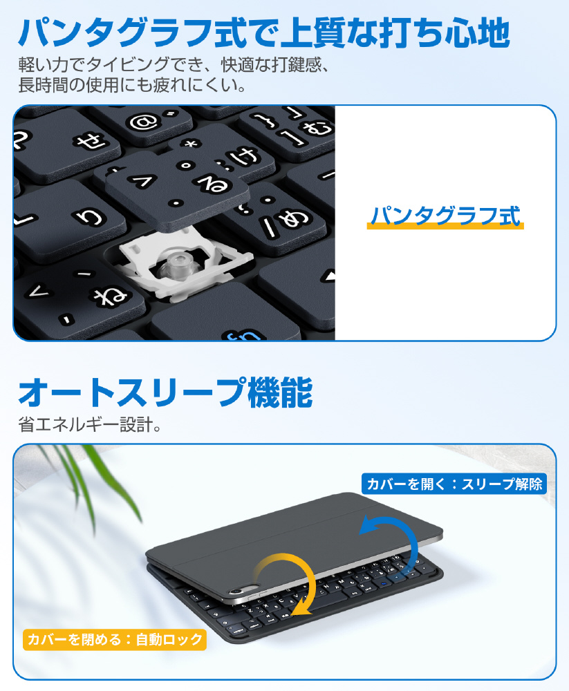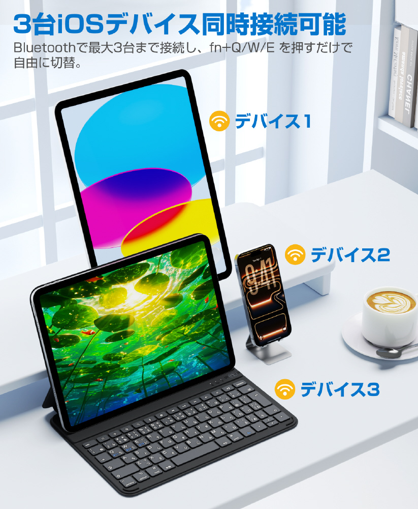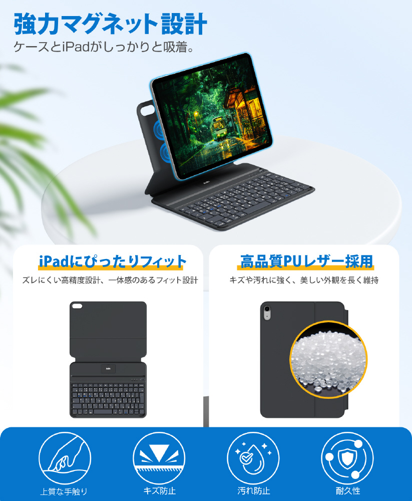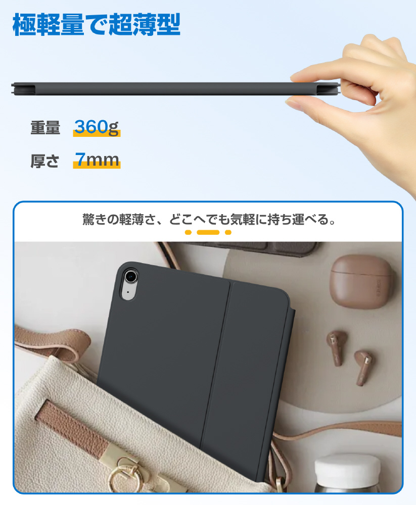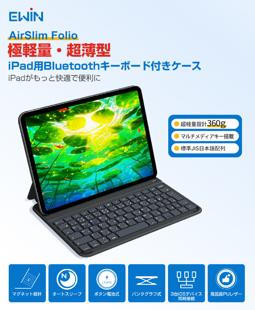 AirSlim Folioは、磁気吸着設計によりiPadへスマートに装着できるキーボード付きケース。薄さ約0.7cm・重さ約360gのスリム設計で携帯性を損なわず、iPadをノートPCのように活用可能。最大3台マルチ接続対応の実用性に優れたモデルです。