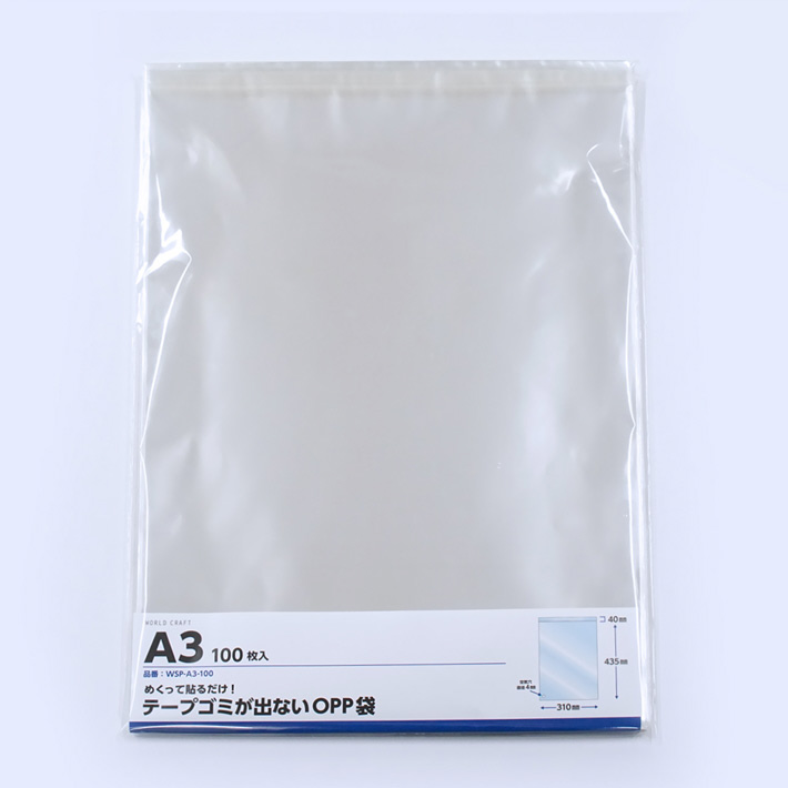 | 商品名 | めくって貼るだけ!テープゴミが出ないOPP袋 100枚入 A3サイズ WSP-A3-100 |