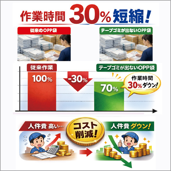 テープ不要でゴミが出ず、作業効率を高めてコストを削減するOPP袋