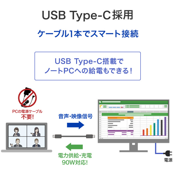 ノートPCをUSB Type-Cケーブルで接続することにより、映像や音声の入力、ノートPCへの給電および充電がケーブル1本で行われ、使用するコンセントも最小限に抑えられます。