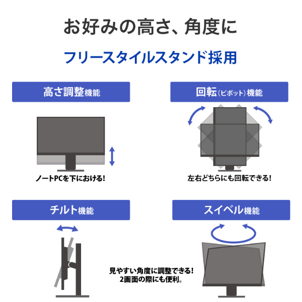 スタンドは高さ調整が可能なフリースタイルスタンドを搭載しており、設置環境に応じた柔軟なレイアウトが可能です。