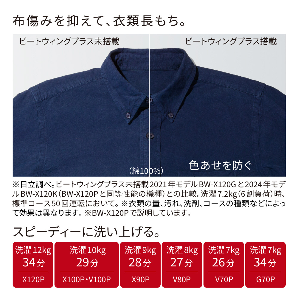 [ビートウィングプラス(回転羽根)]が生み出すスピード浸透水流で、洗剤液の浸透を促進し、衣類7kgを約34分で洗濯します。