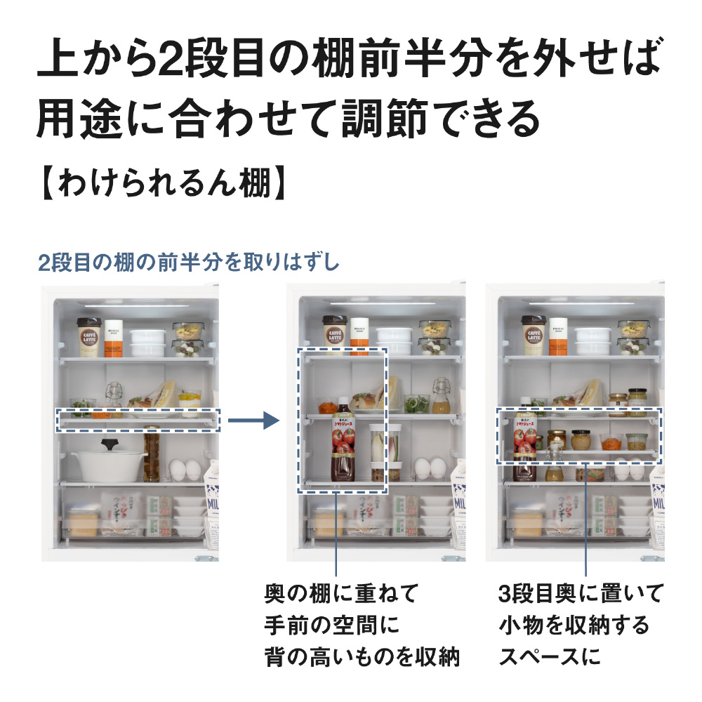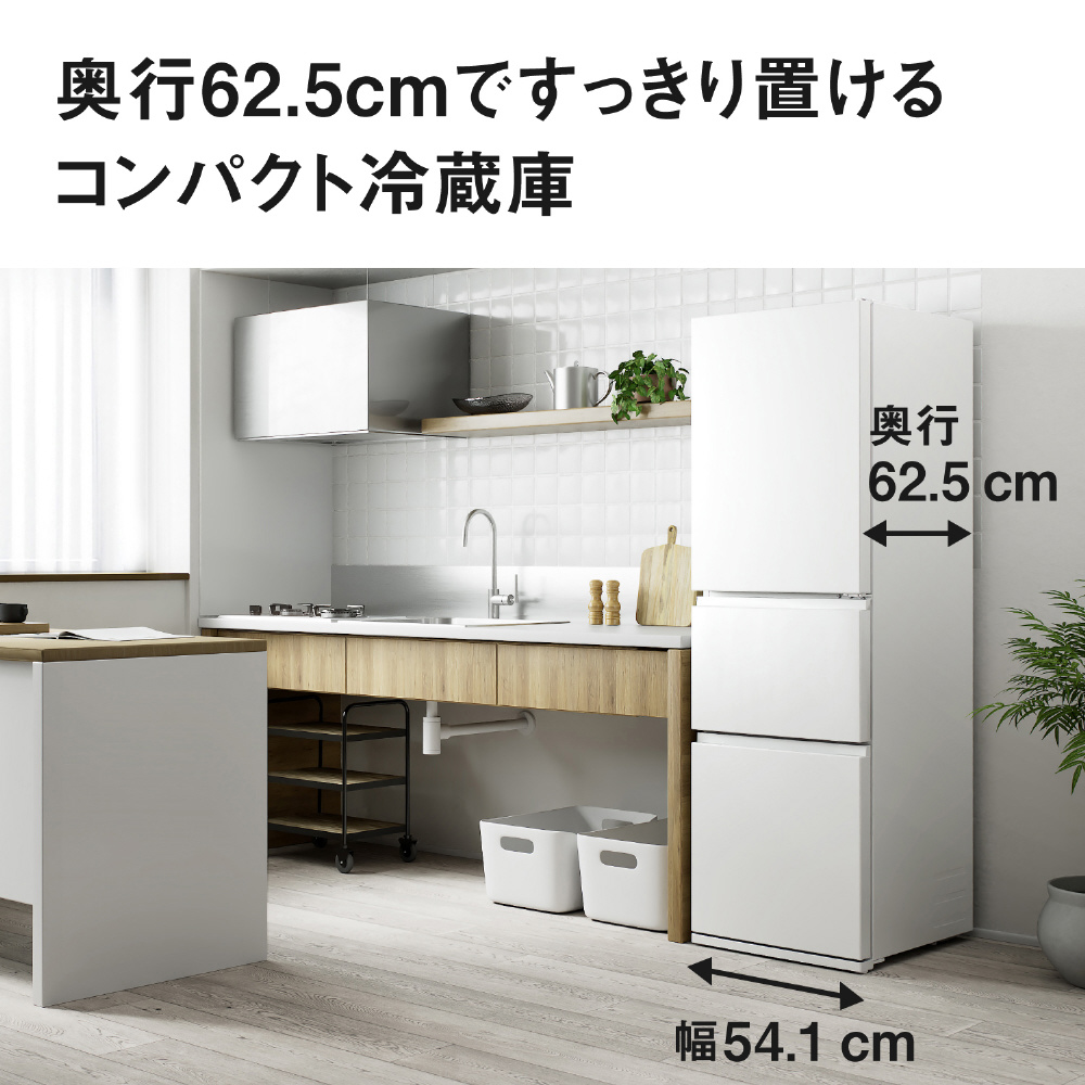 <B>限られたキッチンスペースにもすっきり収まる、奥行62.5cm<BR><BR>幅54.1cm×奥行62.5cmのコンパクト設計だから、作業スペースにもゆとりがうまれる<BR><BR><B>キッチン空間になじむマットなデザイン<BR><BR>落ち着いた質感のマットカラーが住空間に溶け込む<BR><BR><B>食品を整理しやすい庫内設計<BR><BR>ワインボトルなど背の高いものを収納できる冷蔵室「わけられるん棚」<BR>冷凍食品がタテに収納できて見つけやすい冷凍室「上段深型ケース」