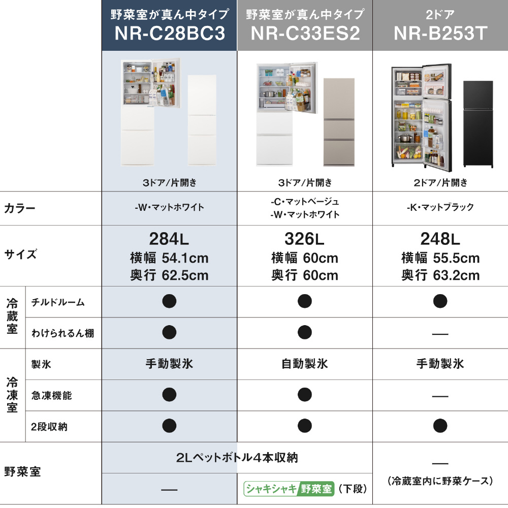 | 商品名 | 冷蔵庫 BCタイプ マットホワイト NR-C28BC3-W [54.1 /284L /3ドア /右開きタイプ /2026年]【基本設置料金セット】 |