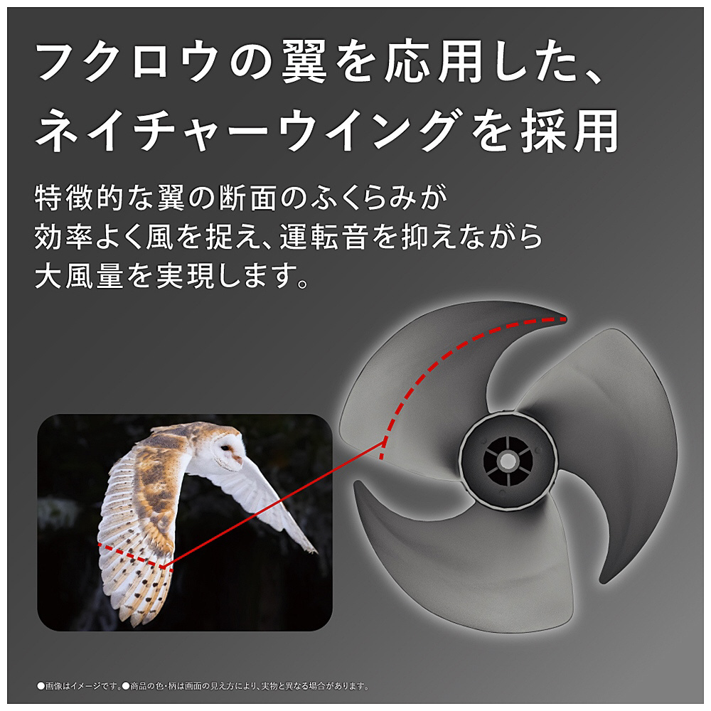羽音を抑えながら、ゆっくり力強く羽ばたく「フクロウの翼」を応用。特徴的な断面のふくらみが効率よく風を捉え、運転音を抑えながら大風量を実現します。