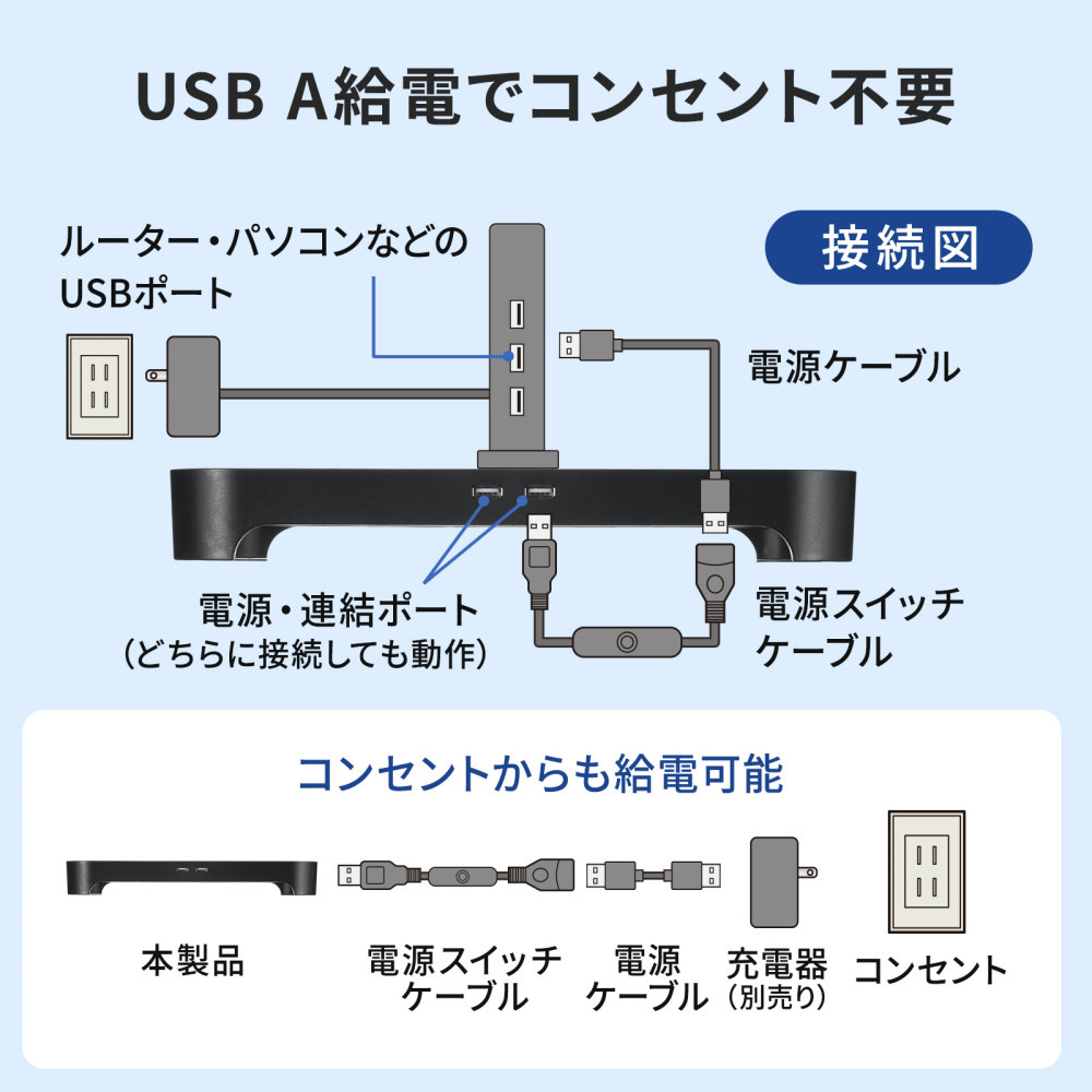 ■Wi-Fiルーターなどの機器から付属のUSBケーブルで接続するだけで動作します。
