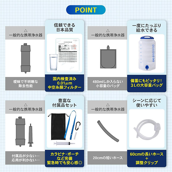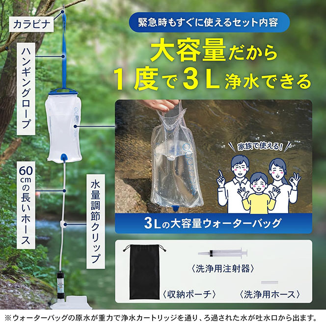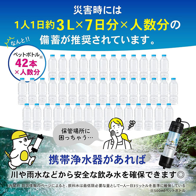 地震・台風・豪雨などの自然災害により、断水や水源の汚染が発生することは珍しくありません。PYKES PEAK「SONAERU」携帯浄水器は、そんな非常時に役立つ防災アイテム。川の水や雨水、お風呂の残り水などをろ過し、透き通った飲み水へ変換できます。防災リュックや非常用持ち出し袋に加えておくことで、水の確保に備えることができ、災害対策の一環として非常に有効です。携帯性にも優れ、アウトドアや旅行でも活躍します。