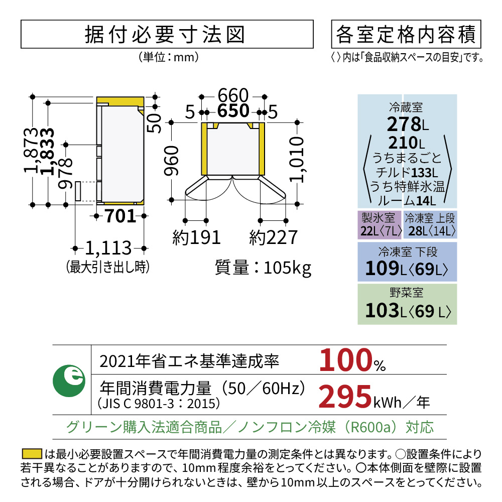 ひろびろ使えて整理がらく、まんなか3段大容量冷凍。冷蔵室の全段どこでもチルド保存「まるごとチルド」。「特鮮氷温ルーム」など鮮度保持機能でおいしく保存