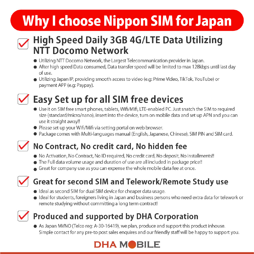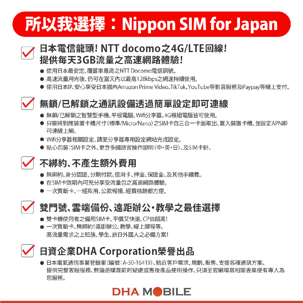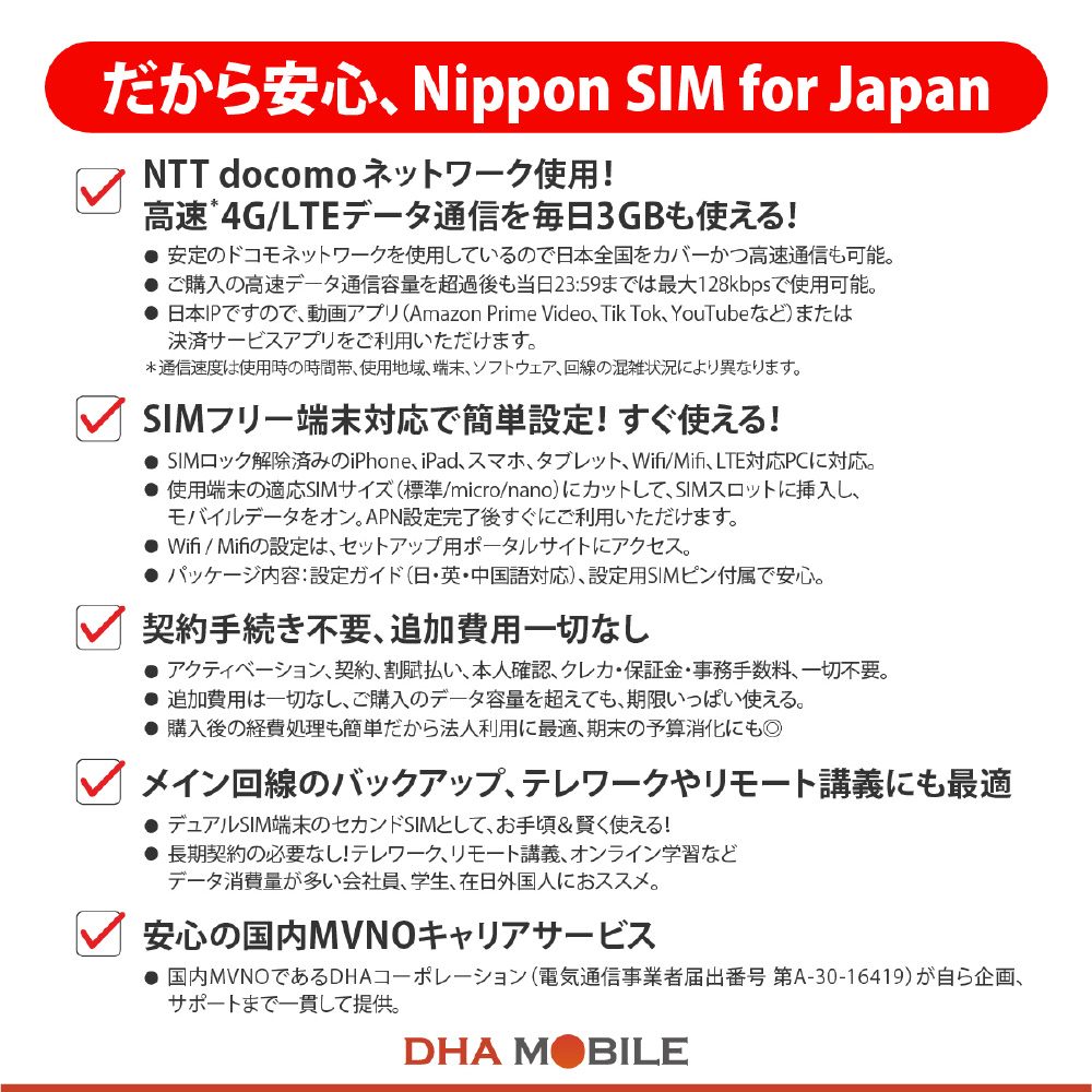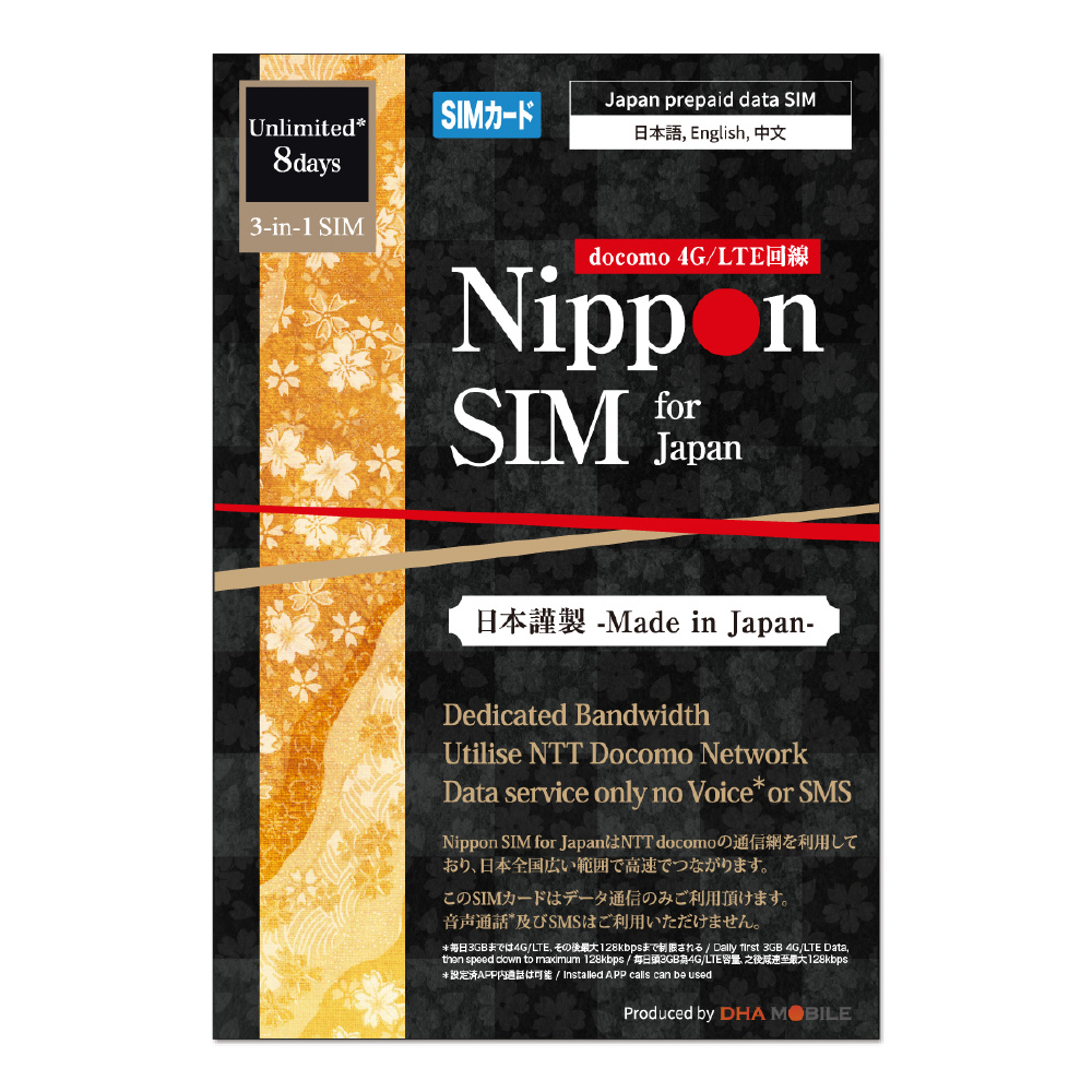 Nippon SIM for Japan 無制限版 8日 毎日3GB 日本国内用 ドコモ回線 プリペイドデータSIMカード DHA-SIM-417 [マルチSIM /SMS非対応]