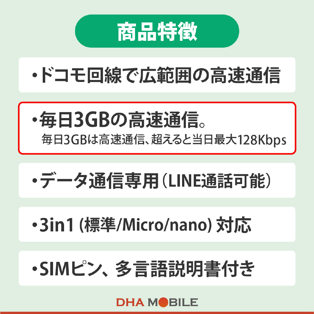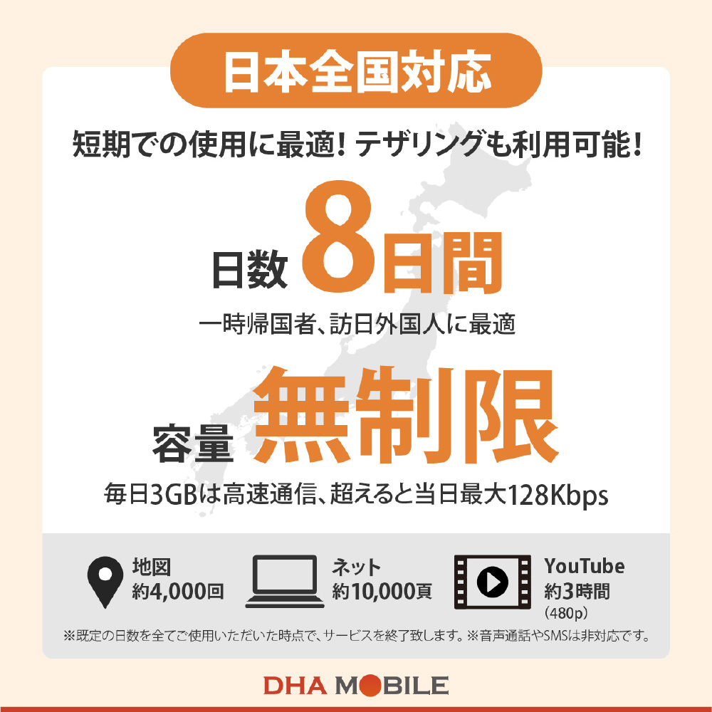 ■メーカー型番 DHA-SIM-417■日本国内用 8日間 無制限 (毎日3GBは高速、超えると当日最大128kbps) docomo フルMVNO回線 4G/LTE データ通信専用