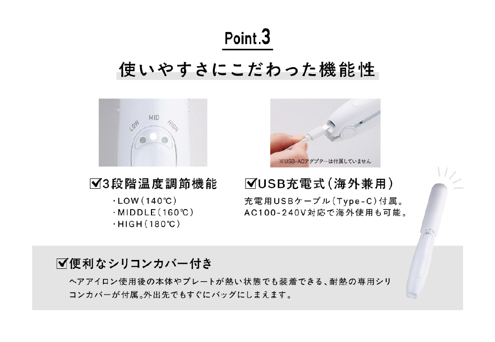 対応のUSB-ACアダプター使用で、海外でもカワイイヘアをキープ!
