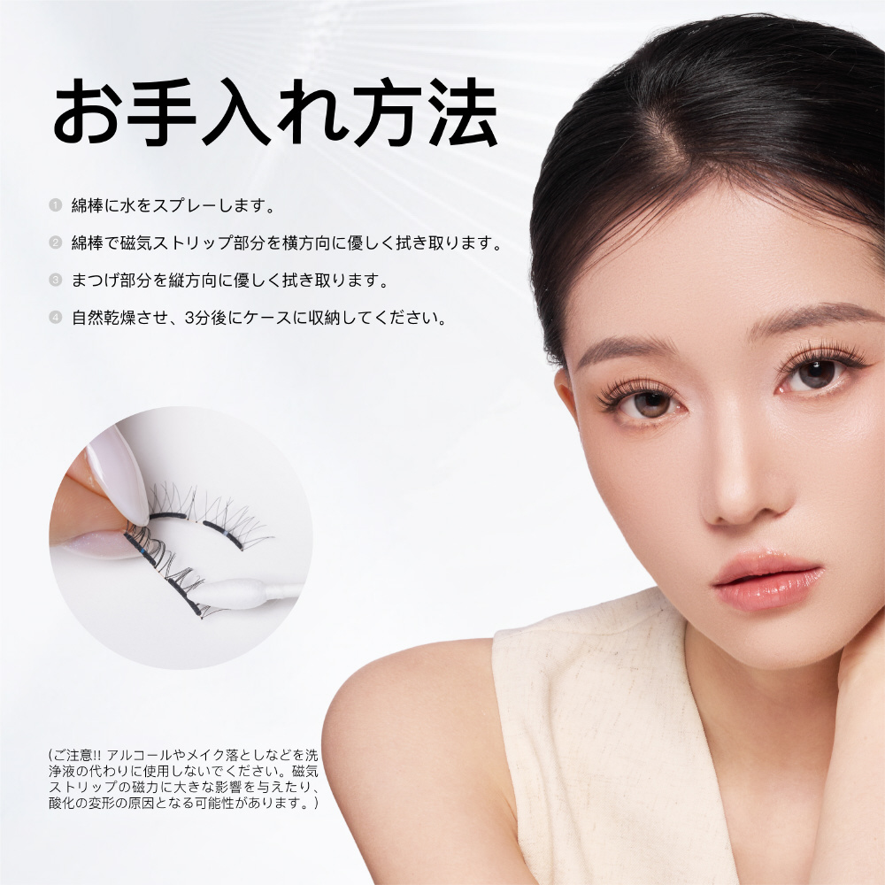鏡付きの一体化ケースで持ち運びに便利。内蓋付きで紛失防止や埃の付着を防いでくれる。独占技術で製造されたソフトマグネットを使用。まつげの一本一本が手編みで製造され、より優れた使用感と美しい仕上がりを実現。まつげの素材には特殊な抗菌剤を使用しており、菌の繁殖を防いでくれる。接着剤いらずで繰り返し使用でき、自まつげや目に優しい。挟むだけですぐ付けられるので、日々のメイクが時短に。