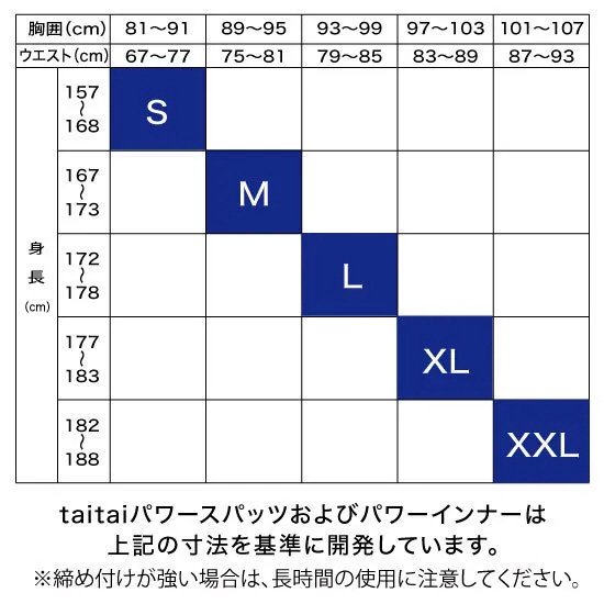 taitaiパワースパッツおよびパワーインナーは上記の寸法を基準に開発しています。