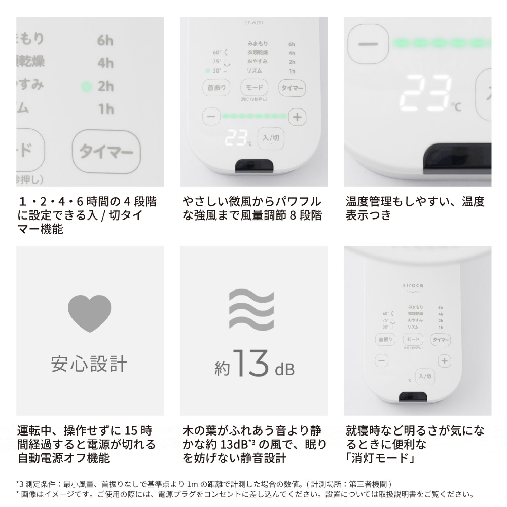 羽根・ガード・モーターを組み合わせたシロカ独自の特許技術により、睡眠を妨げない静かで柔らかい微風から、室内の換気や衣類乾燥に最適な直進性の高い強風までを1台で実現しています。